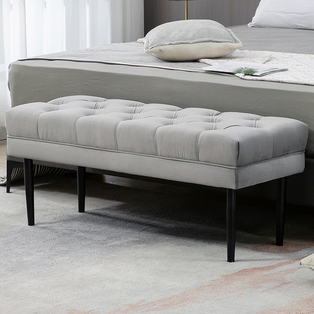 Add an elegant and charming seating space to your home with this Portland Grey Tufted Window Seat. It's crafted from rubber wood for added strength and is fitted with metal legs for strong support. The bench features a sponge-filled top to make the seating comfortable. It comes in a charming grey colour and features beautiful tufted velvet-feel upholstery, so you can add a touch of style to your interiors.