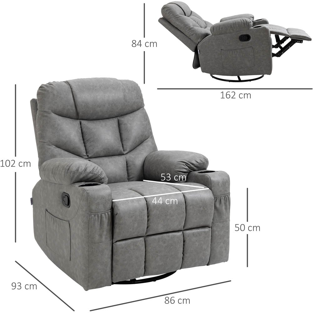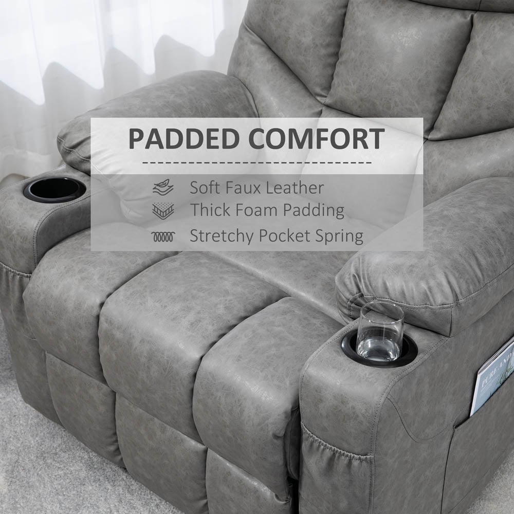 Relax in style with the Portland Grey Faux Leather Recliner Armchair with Footrest. The chair has a manual reclining, which allows you to adjust the back to a maximum 135° angle. It has a stylish design with faux leather upholstery that feels great against the skin and is easy to clean. The thick and all-over padding provides extra comfort, and the cup holders make it an ideal companion for binge-watching. Additionally, the pocket spring system, high back, armrests and swivel feature make it the must-have in every house.