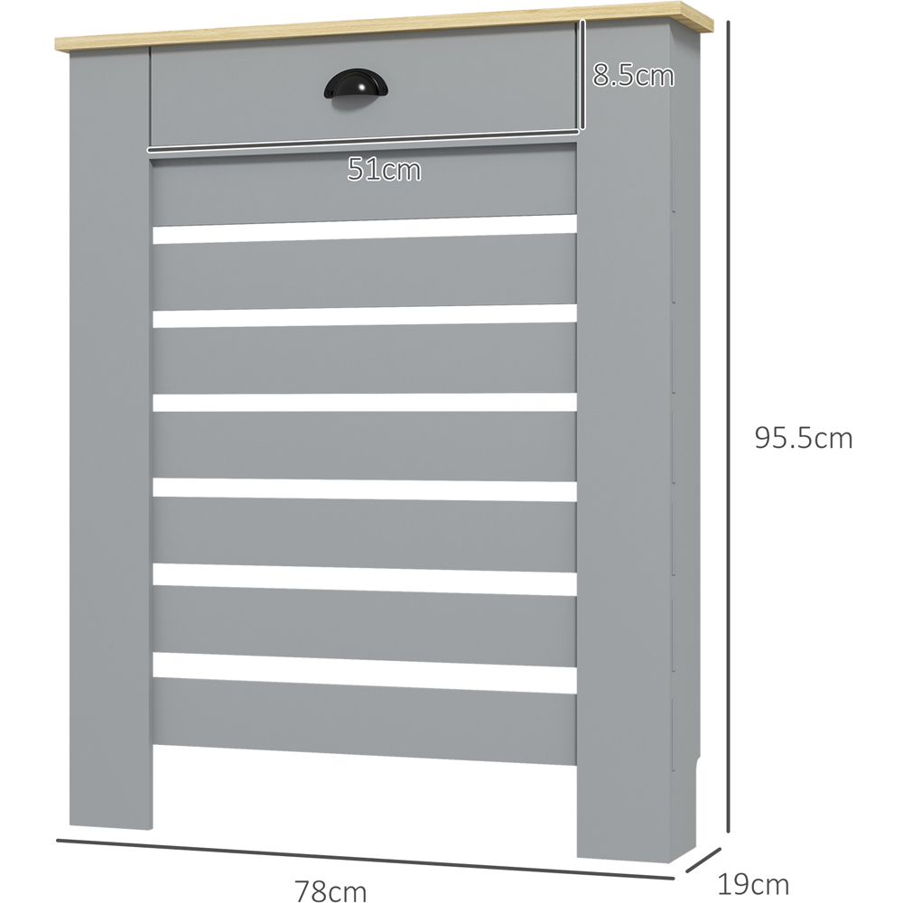 Enhance your home's warmth and safety with the Portland Radiator Cover, featuring a cleverly integrated top drawer. This chic grey radiator cover, crafted from a durable mix of MDF and particle board, boasts a horizontal slat design that allows heat to circulate freely, keeping your room snug without compromising on safety. The design includes an open bottom to accommodate skirting boards, and the cover is suitable for radiators up to 81 x 107cm. The addition of a handy drawer provides a discreet storage solution, making it as functional as it is stylish.