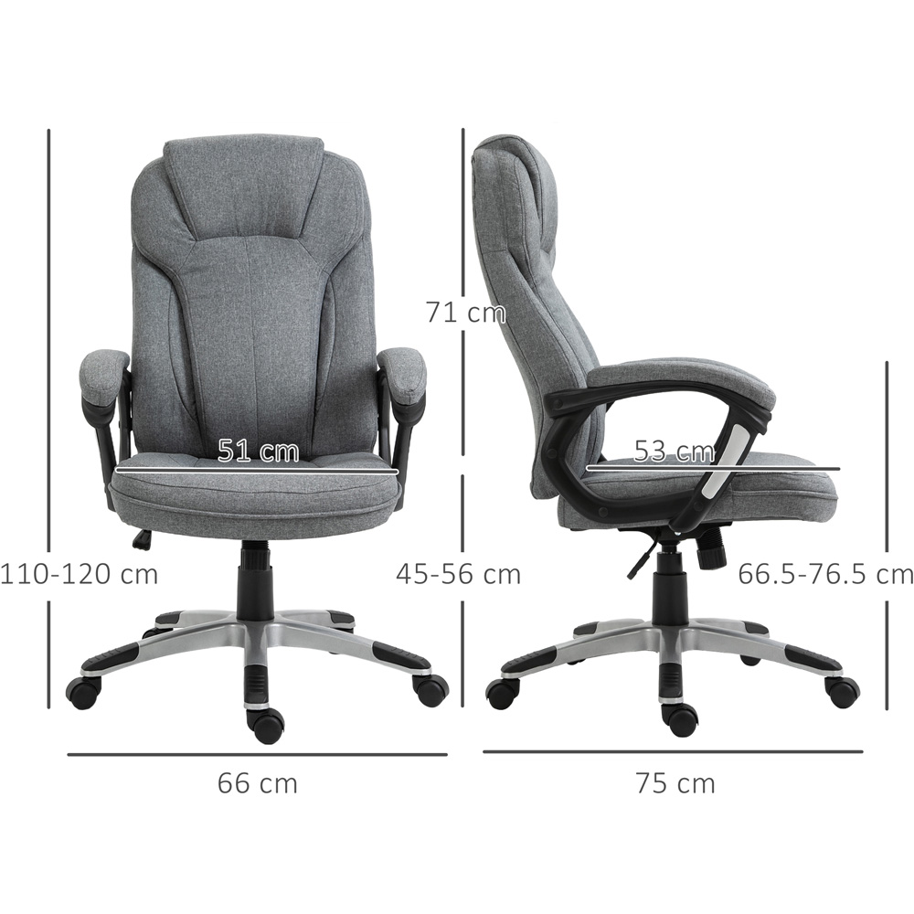 The Portland Grey Linen Fabric Home and Office Swivel Chair offers adjustable height, ranging from 45 to 56cm, allowing you to position the chair at your desired level. This feature makes it suitable for various individuals and table heights. The chair is designed ergonomically, featuring a spacious seat, high back, and fixed armrests. It provides proper support to your body while sitting and working, ensuring comfort throughout the day. Additionally, it includes a padded headrest for extra support. The chair is also incredibly comfortable, with its all-over padding and smooth linen-look upholstery, making it ideal for both work and leisure purposes.