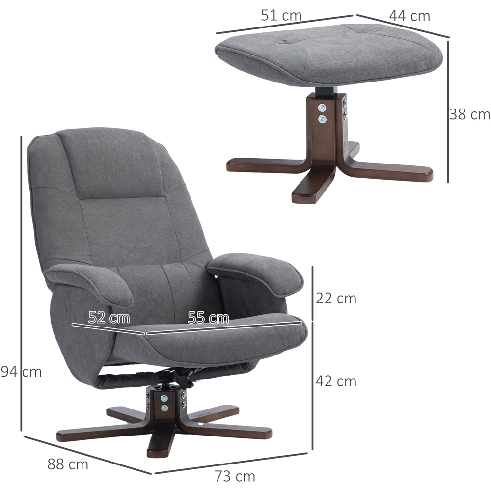Experience ultimate relaxation with the Portland Grey Linen Swivel Manual Recliner Chair with Footstool. This set offers double the comfort, allowing you to recline and elevate your body at the same time. The chair's 145 degrees reclining back provides the flexibility to find your desired position. With its sponge-filled cushioning, you can enjoy optimal comfort. The smooth linen-look upholstery adds a touch of elegance. Both the chair and footstool are supported by sturdy wooden bases, ensuring full support and stability.