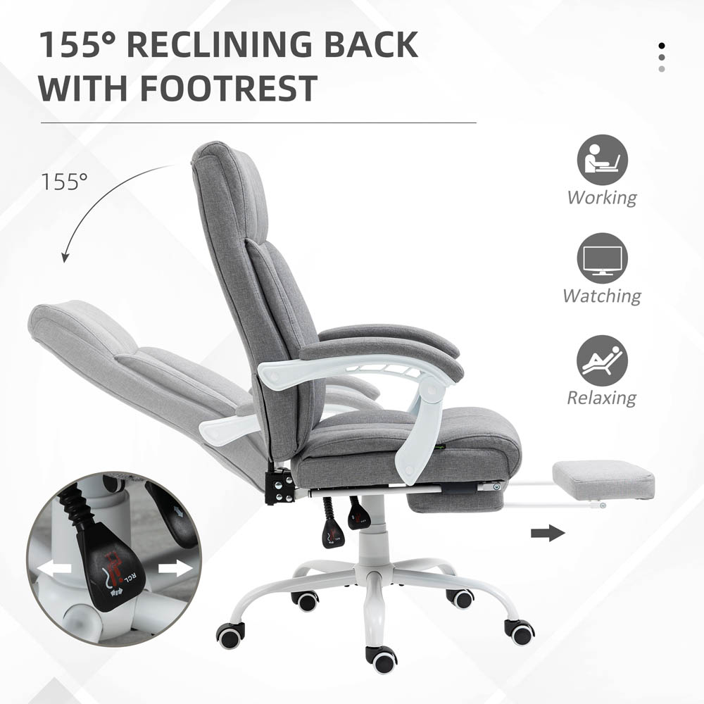 Start your journey to comfort and efficiency with the Portland Grey Fabric Recliner Executive Office Chair with Footrest. You can lean back and elevate your lower body in this chair, with a 155° reclining back and footrest. The chair is designed to move in motion with your body, avoiding any strains. It also features a high back and armrests for added support and thick padding with linen-look upholstery for all-day comfort. You can adjust the height of the chair from 111cm to 119cm to match it with your desk and work at a comfortable level.