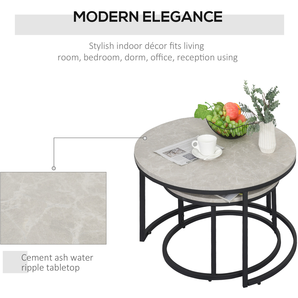 Add style and practicality to your space with the Portland Grey Marble Effect Nest of Tables Set of 2. Featuring a stacking design, the set comes with a large table and a smaller one, allowing the smaller table to tuck underneath the larger one. Compact for storage, and easy to extend the holding and display space when required. Elegant and beautiful, the round table tops, finished in a grey marble effect come with a contrasting black frame to beautify your space. Sturdy and solid, they are made from solid steel and MDF topped for durability. Also, the foot pads ensure extra balance, whilst protecting your floor from marks and scratches. Set of 2.