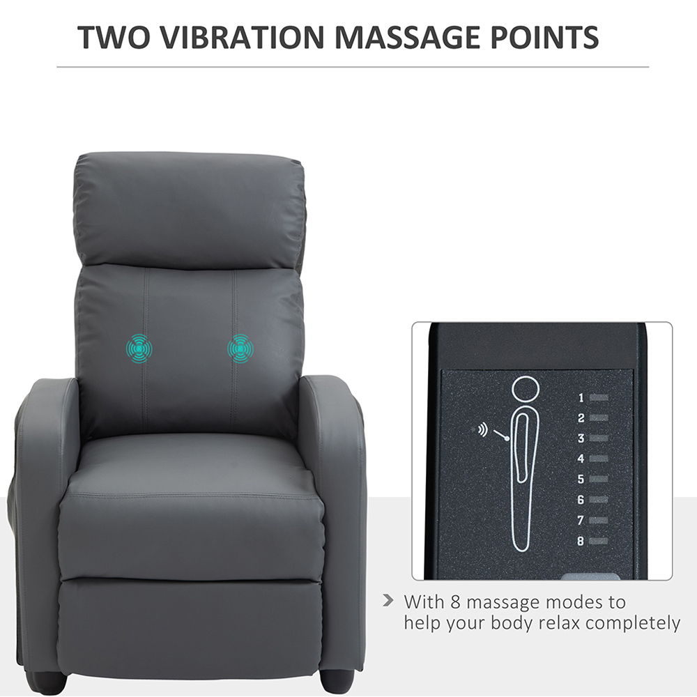 Make a comfy addition to your home with this Grey Recliner Massage Chair from Portland. Complete with a remote control, it features two massage points fitted in the back to relax you and adjustable settings with eight modes to choose from, five intensity levels and two time settings. In the 150-degree reclining position, you can lean back and relax or simply use the retractable footrest for time-outs at home or in the office. Additionally, the chair with PU leather is filled with a thick sponge on the seat and back along with fixed armrests and high back for added support. Plus, it also has a side pocket, so you can keep your favourite things handy.