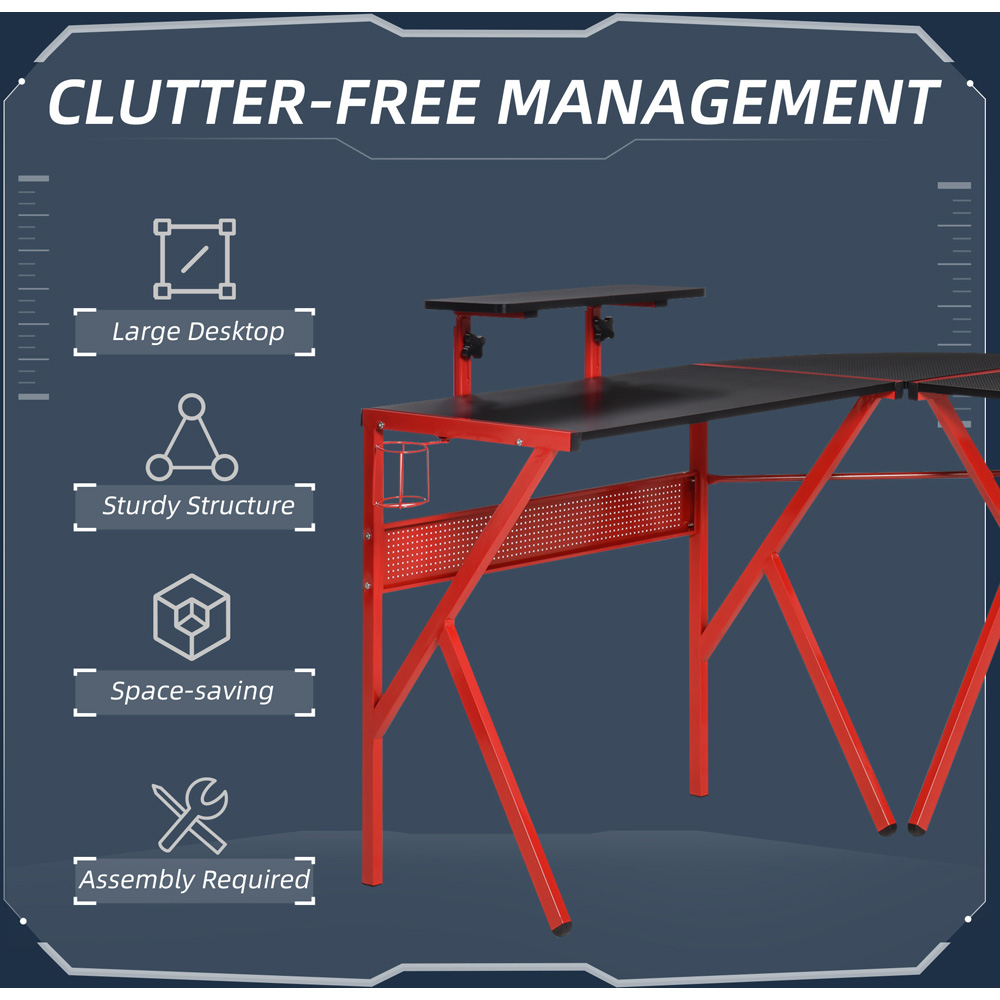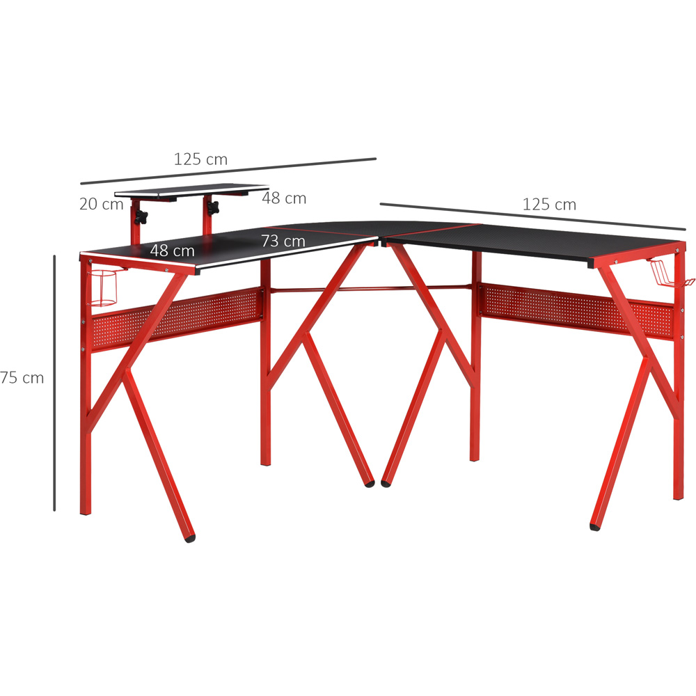 Maximise your gaming experience with the Portland Black and Red L-Shaped Gaming Desk. With an adjustable monitor stand, this large desktop provides plenty of space for your game monitors, keyboard and other gaming equipment. The L-shaped design makes this desk space-saving and suited for corner use. Durable and sturdy, the particle board surface with carbon fibre texture is durable and anti-scratch. Also, the two cross panels and a K-shaped metal frame help to stabilise the corner gaming desk and prevent it from wobbling. Plus, the table provides more functionality, including a cup holder, headphone hook and three-level adjustable monitor shelf. Size: 75 x 125 x 125cm.