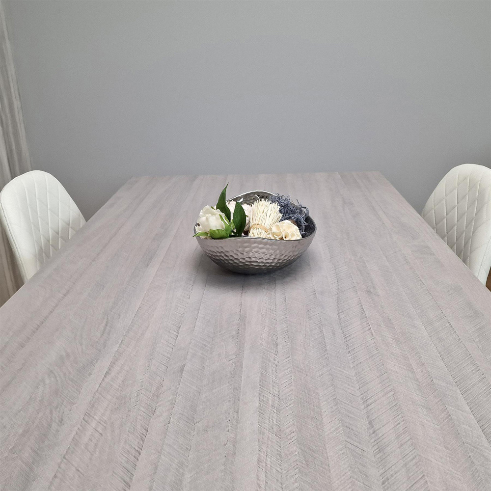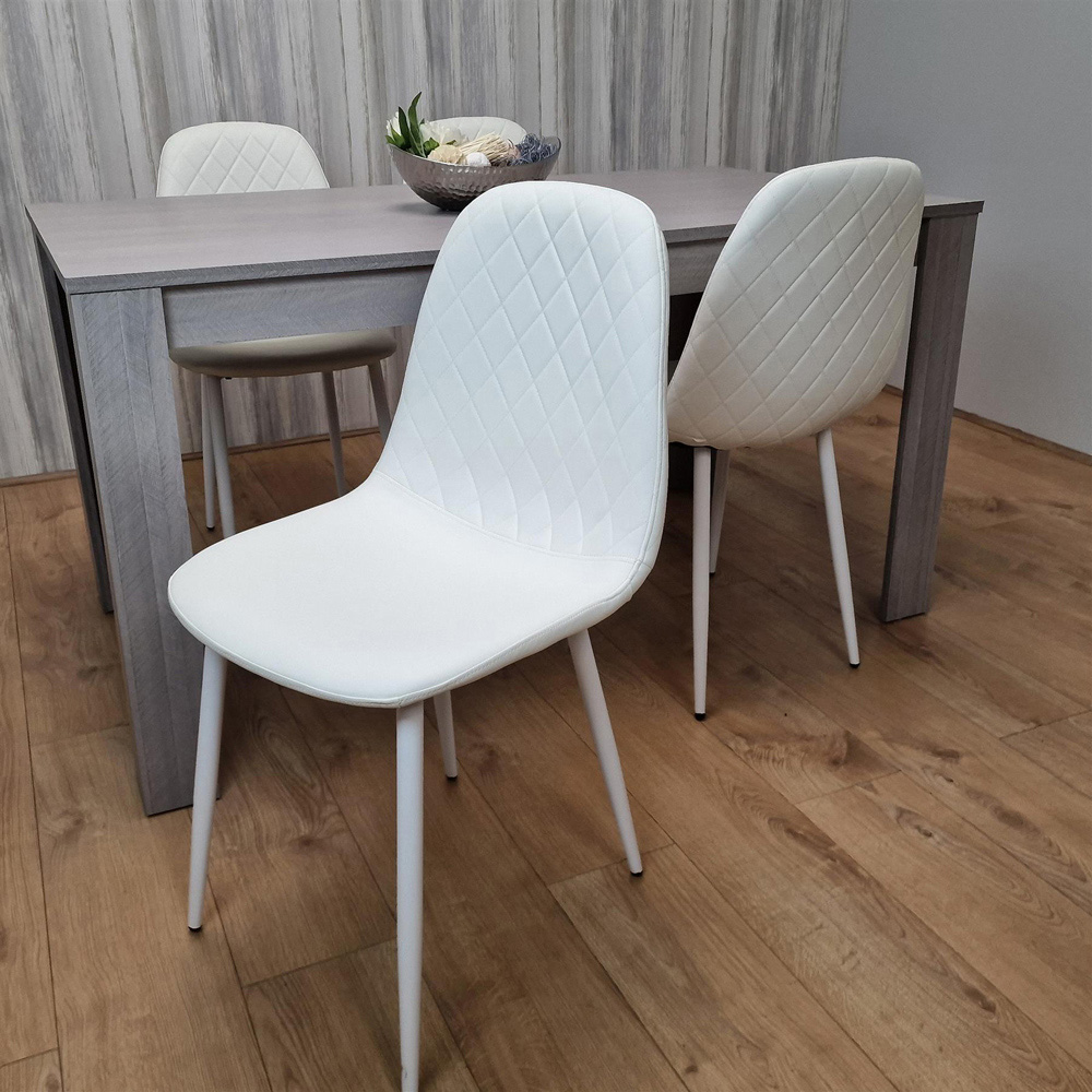 Enhance the elegance of your dining space with the Portland 4-seater Dining Set. This exquisite set includes a sophisticated light grey wooden dining table paired with four white coloured chairs. The chairs feature diamond-stitched patterns on both the front and back, adding a touch of luxury to your dining experience. Crafted with high-quality MDF and a melamine laminated finish, the table ensures a durable and long-lasting surface. The chairs are made with premium leather and sturdy metal legs for added stability. Assembly is made simple with clear instructions provided. Chair dimensions: H85 x W44 x L52cm. Table dimensions: H75 x W77 x L117cm. Seat height of chairs: 44cm.