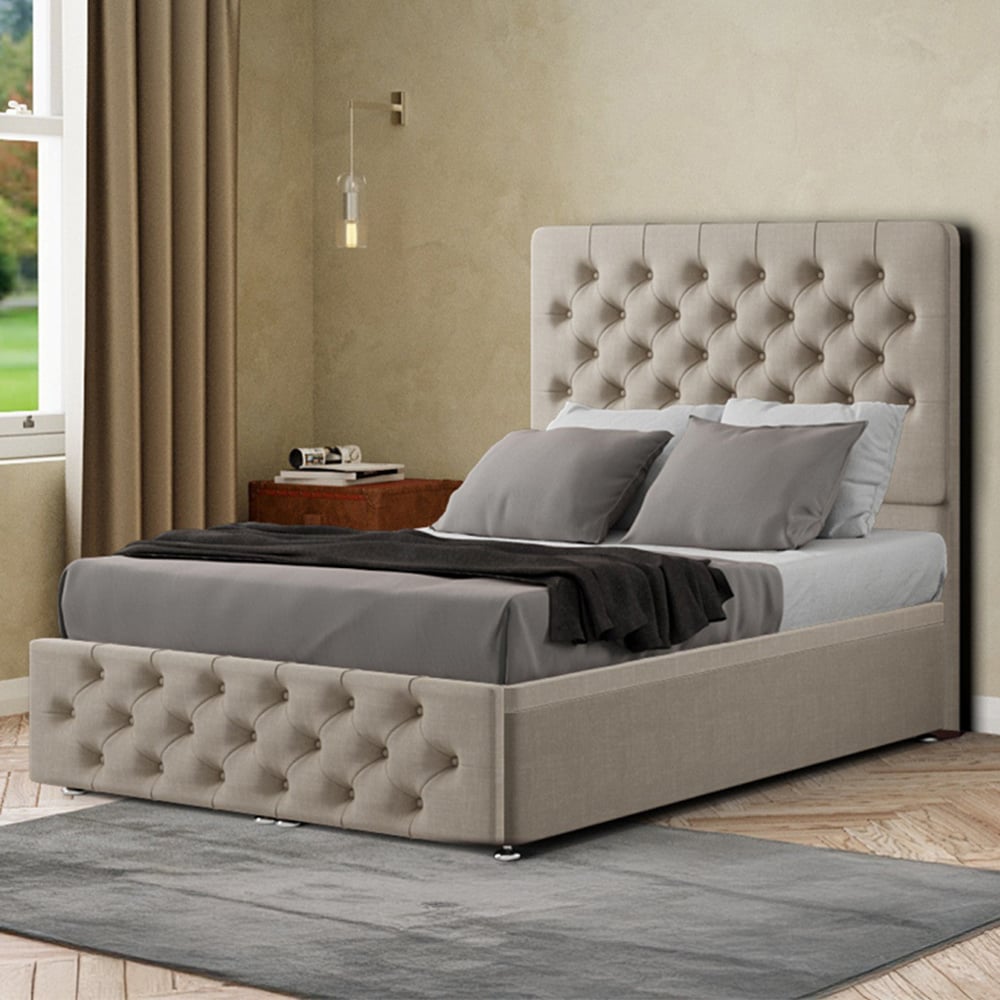 Introducing the Mary Chesterfield Gas Lift Ottoman End Lift Bed - Crafted with Precision in the UK for Uncompromising Quality! Impeccable Design: Elevate your bedroom with the floor-standing headboard adorned with matching buttons, radiating sophistication and luxury. Gas Lift Convenience: Effortlessly access the spacious storage area beneath the bed with the convenient gas lift mechanism, combining style with practicality. Premium Quality: Crafted with top-tier materials, this ottoman bed is built to last, providing you with years of dependable use. Mattress Not Included: Please note that the mattress is not included, allowing you to personalize your sleep experience.