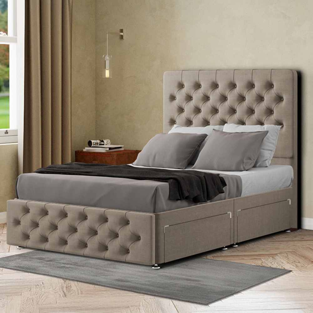 Introducing the Mary Chesterfield Divan Bed with 2 Drawers and a Floor Standing Headboard - Crafted with Excellence in the UK! Made in the UK with precision and care, the Mary Chesterfield Divan Bed is the epitome of luxury and style for your bedroom. This elegant divan base comes equipped with two convenient drawers, providing ample storage space for your essentials while maintaining a sleek, clutter-free appearance. The exquisite Chesterfield design is adorned with matching buttons, creating a timeless and sophisticated look that complements any decor. The Mary Chesterfield Divan Bed is ready to pair with your preferred mattress, allowing you to personalise your sleep experience. Crafted with the utmost care and using high-quality materials, this divan bed is built to last, providing you with years of restful nights and stylish elegance. Upgrade your bedroom with the Mary Chesterfield Divan Bed and experience the epitome of comfort, style, and functionality. Make your bedroom a haven of luxury - order yours today!
