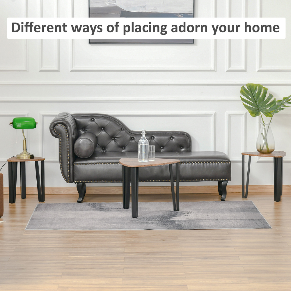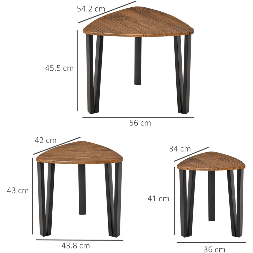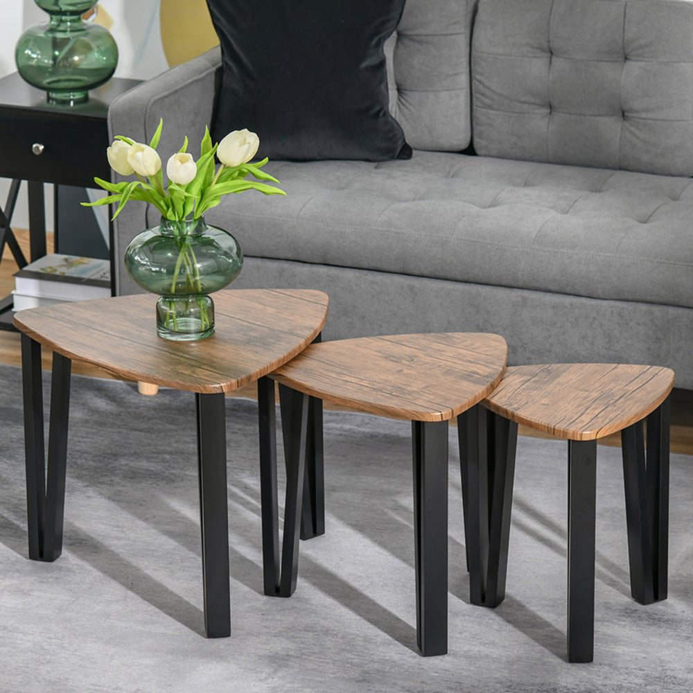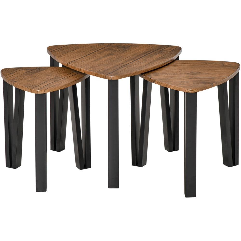 Add style and practicality to your space with the Portland Steel Nest of Tables Set of 3. Comprised of a large, medium and small triangle table, these nesting tables give you plenty of space for magazines, cups, plates and storage. Also, the V-shaped peg legs are placed on each corner in a double shape for extra sturdiness and stability for the end tables, with foot pads to protect the floor from damage. Sturdy and stylish, the worktop is finished in a beautiful walnut tone and soft around the edges so you do not hurt yourself. Set of 3.