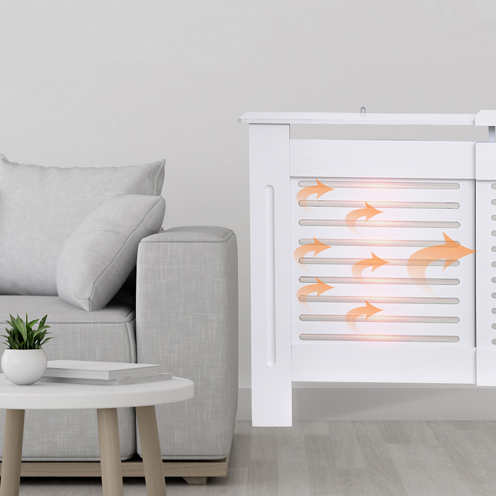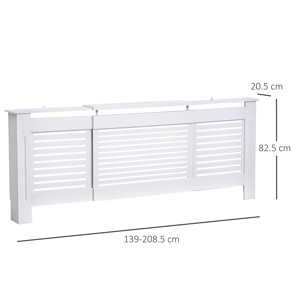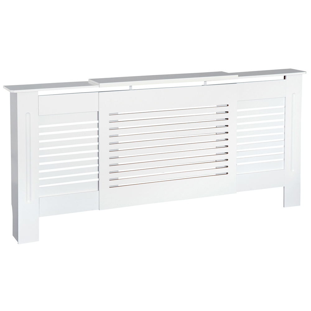 This modern and contemporary styled radiator cover from Portland is a great way to enhance the look of any room. Most radiators are unsightly, and this can add a touch of elegance. Made from white-painted MDF, it is ready to be assembled and installed without the need to add any finishing touches. It is also a great way to keep your children and pet safe from touching the hot radiator surface and causing injuries. You can adjust its length easily to suit your radiator size. The slatted design allows airflow efficiently without restricting the heat to be radiated to the room. This is an elegant and practical addition to any home and office. The cover is extendable (from 139 to 208.5 cm) to perfectly fit your radiator and home decor. Size: 82.5 x 139-208.5 x 20.5cm.
