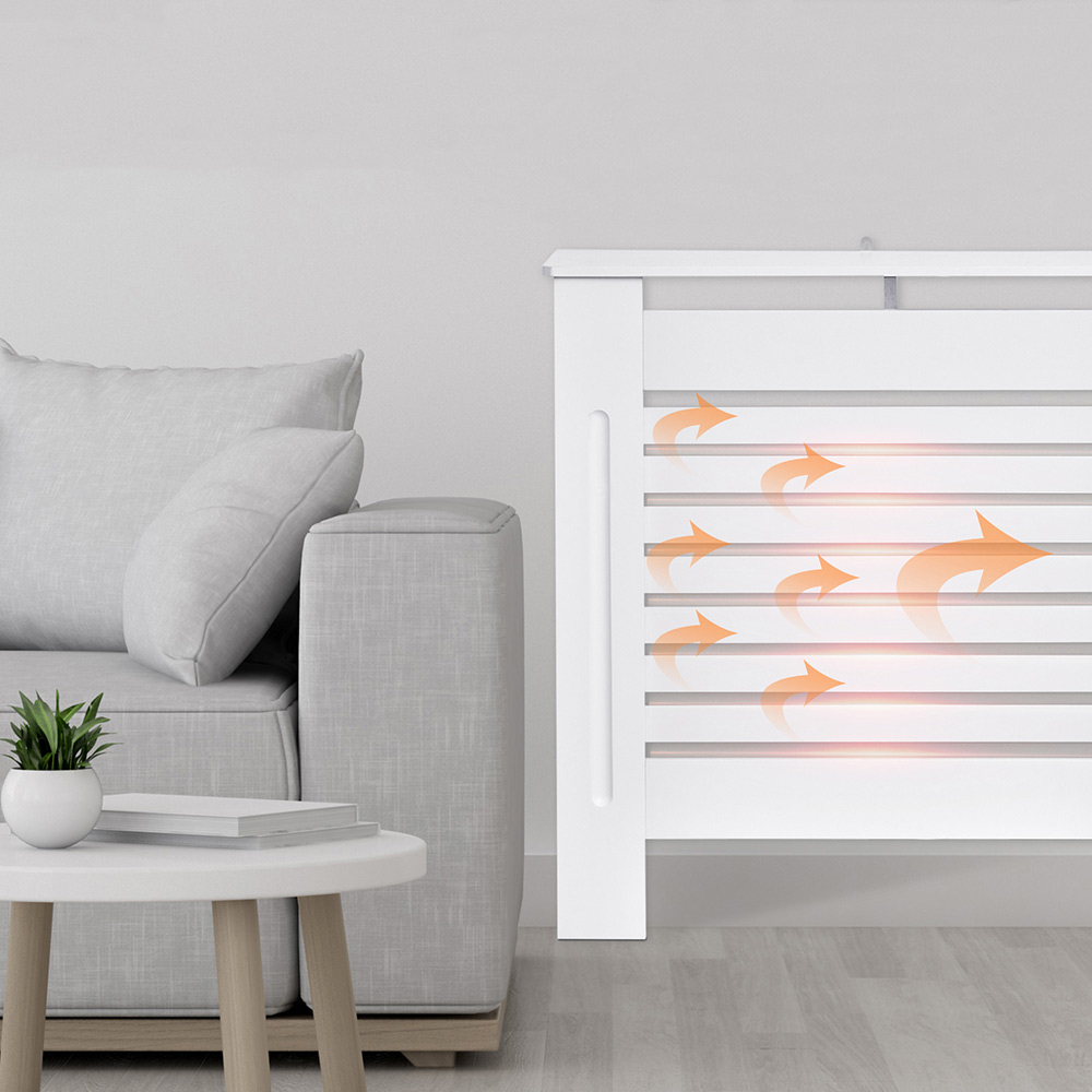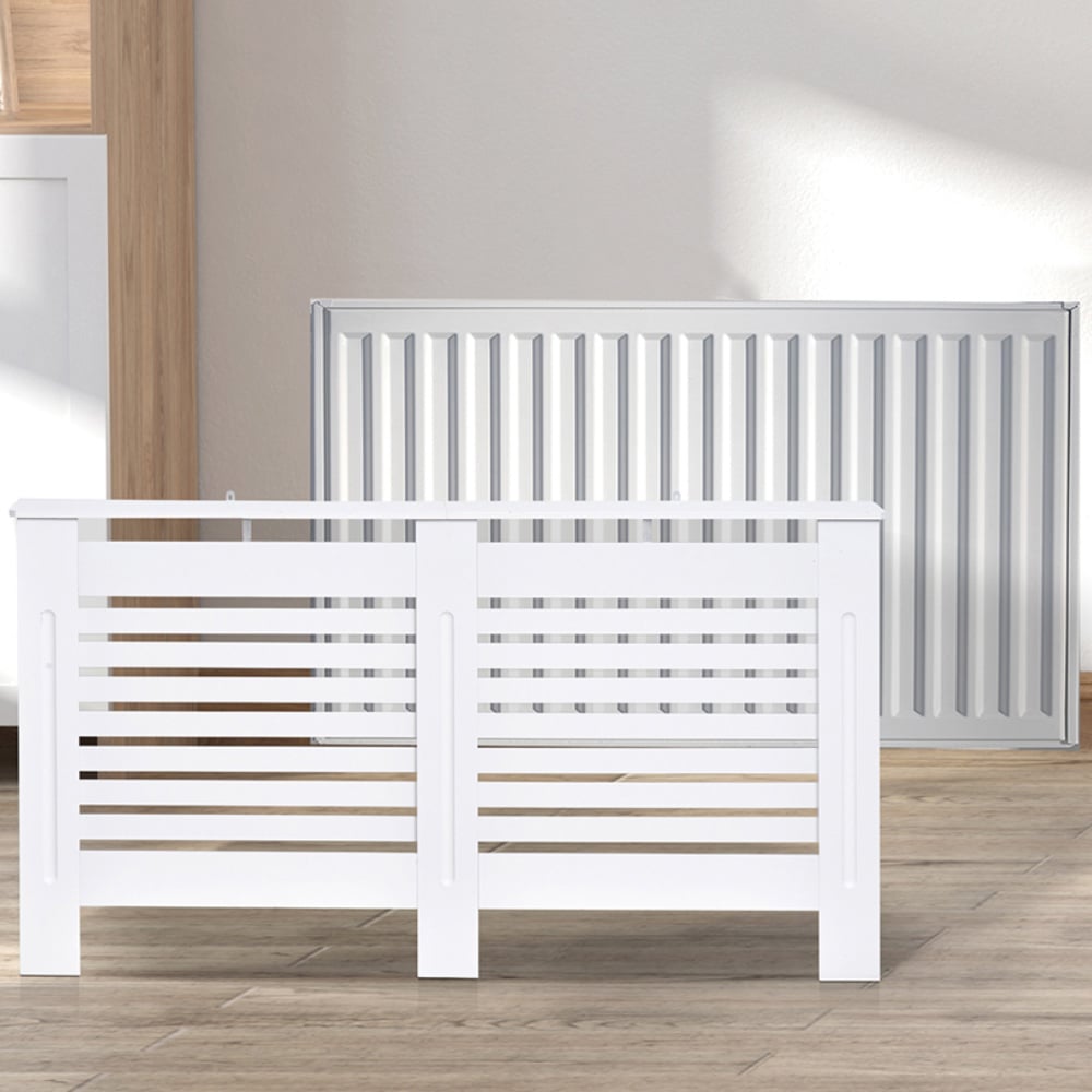 This modern radiator cover cabinet from Portland is designed to help hide old or unsightly radiators, protect hands from a hot surface and offer extra shelving for ornaments. Made from E1 grade MDF and particle board and finished in white, it is ready to be assembled and installed without the need to add any finishing touches. The slatted design with sufficient vents allows for fluid heat flow while still preventing children and pets from touching the hot radiator surface and causing injuries. This stylish radiator cover is designed to give an elegant and practical addition to your home and office. The light gross weight makes it easy to move. Ideal for protecting and displaying. It features an additional top shelf space for displaying photo frames, books, or ornaments. The radiator cover cabinet is sturdy and durable. Size: 81 x 152 x 19cm.