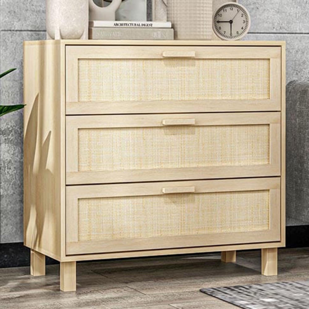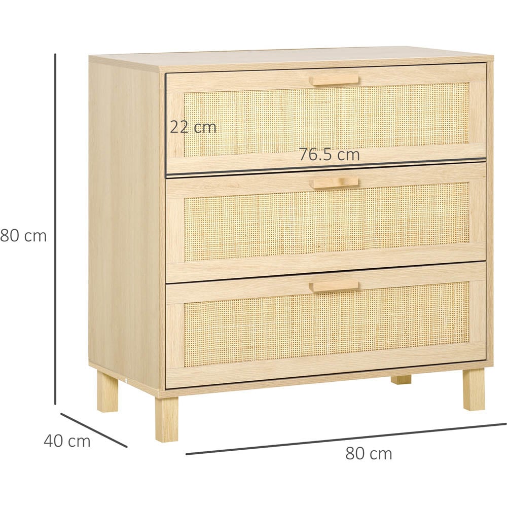 Ensure your space is kept tidy and clutter-free with the Portland Natural Wooden Storage Unit. Featuring rattan weave panels placed in the middle of the drawers - it adopts a cool and different look. The three drawers offer plenty of storage room to keep your space clutter-free. Made from MDF structure - this durable and reliable chest of draws is perfect for everyday use. The natural wood-effect finish mix well with both lighter and darker furniture.