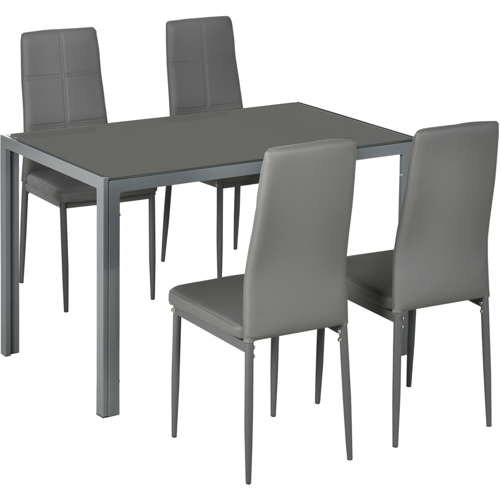 Transform your dining space with the Portland Grey Dining Table with Chairs. This stylish five-piece dining set includes a table and four matching faux leather high-back chairs. Finished with a thick glass tabletop, it looks sleek and classy complementing most decor styles. Also, the chairs are padded so that you can enjoy your meal with comfort. Size: Table: 75 x 120 x 70cm. Chair: 97 x 40 x 50.5cm.