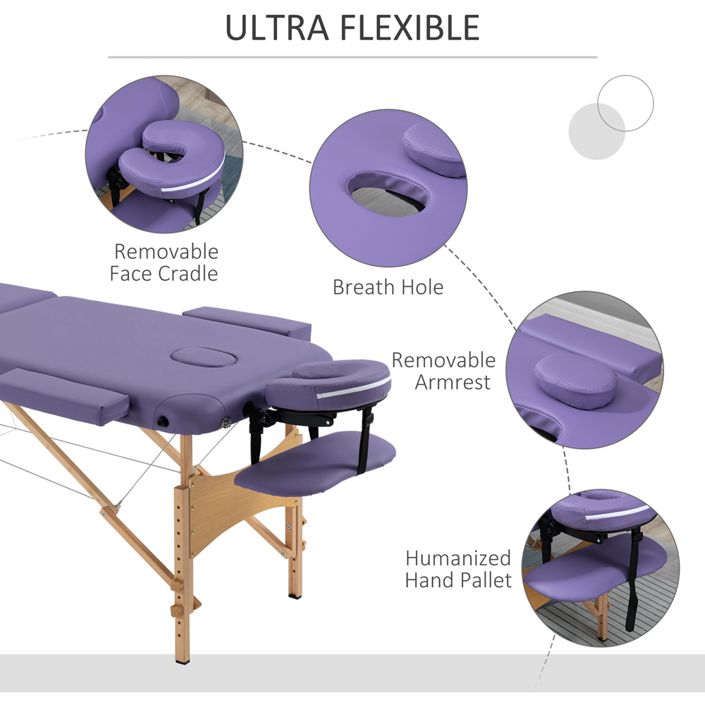 Enjoy comfortable massages and beauty treatments with this Portland Purple Foldable Wooden Massage Table. This massage table features a wooden frame for solid support and is fitted with a padded top bed for comfort. The faux leather cover is smooth on the skin and wipes clean easily. The 61-88cm adjustable height is easily adjusted and can be set to nine positions. It has a foldable design, which allows you to move this eyelash bed where you want. Completed with a handy removable headrest, this wooden massage table is the perfect relaxing option after a hectic day.