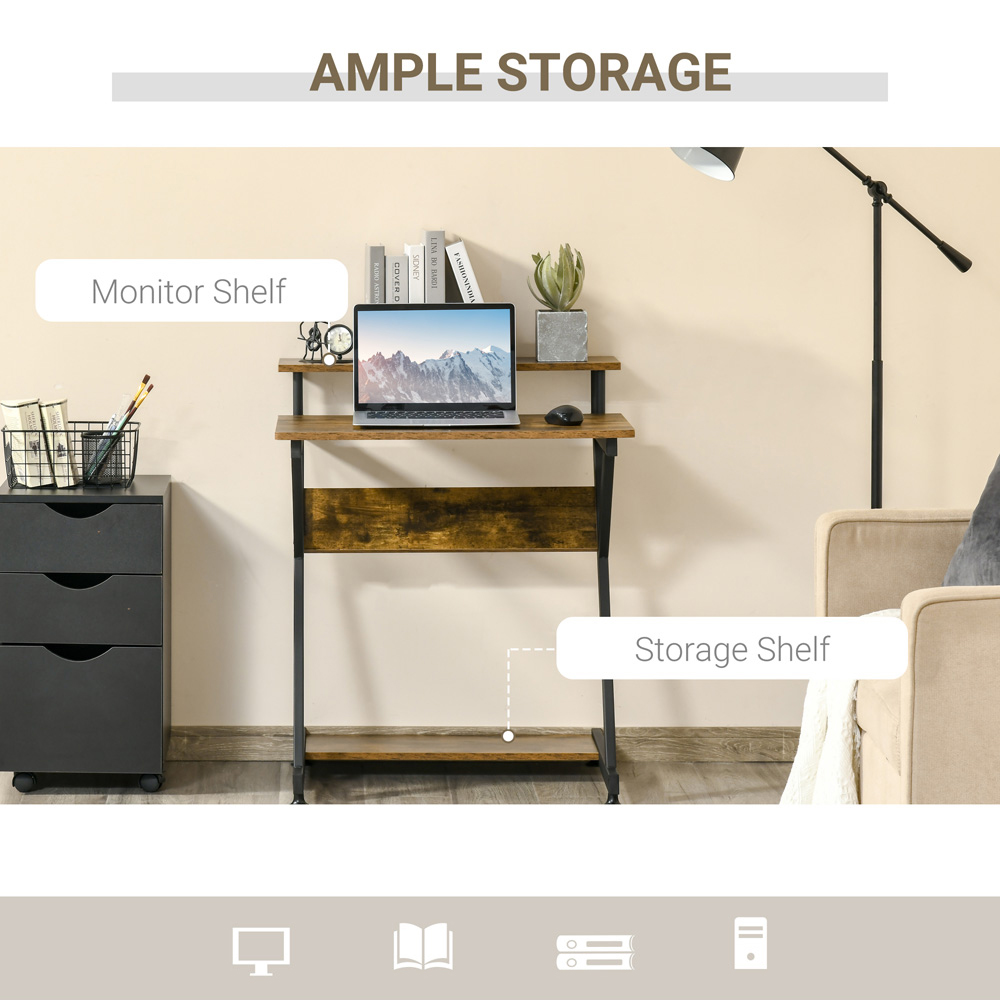 Make practical and stylish addition to your home or office space with this Portland Brown R Shaped Compact Computer Table. With two-tier design - this home office desk is formed of a flat table top and a smaller top shelf. It provides enough room for working and keeping a monitor and other small pieces on it. The vintage-inspired industrial style shelves in a two-tone brown comes in a faded finish for a slightly worn-out look. It also comes with adjustable feet to keep computer table balanced at all times. The work desk makes for a great addition to your home.