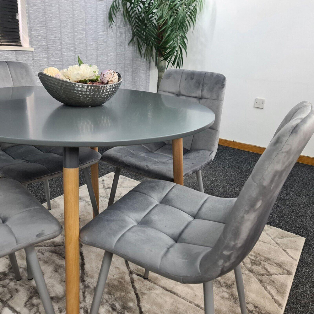 Dine elegantly with the Portland Rocco 4 Seater Round Velvet Dining Set Grey. This beautiful set includes a wooden grey shade round dining table and four tufted velvet grey colour Rocco chairs with slightly curved back designs. The dining table is made with high-quality MDF with wooden legs, ensuring a durable and long-lasting tabletop. The dining chairs are made of premium velvet with metal chair legs, equipped with adjustable foot protection to prevent damage. The dining room chair dimensions are H87 x W44 x L59cm, and the dining table size is H75 x W90 x L90cm. The seat height of the chair is 45cm. This set requires simple assembly with clear instructions provided.