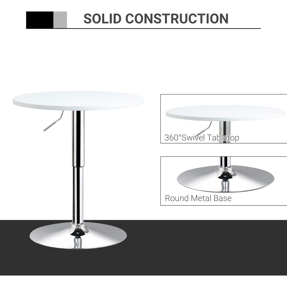 Experience a blend of style and functionality with this Portland Round Adjustable Height Swivel Bar Table White. Crafted from solid metal for sturdiness, it sports a charming minimalistic look with its white tabletop. The swivel tabletop is large and round offering ample holding space so you can dine comfortably. While its adjustable height feature allows you to change its height and pair it with different dining chairs and bar stools to create the perfect ambience for your space.