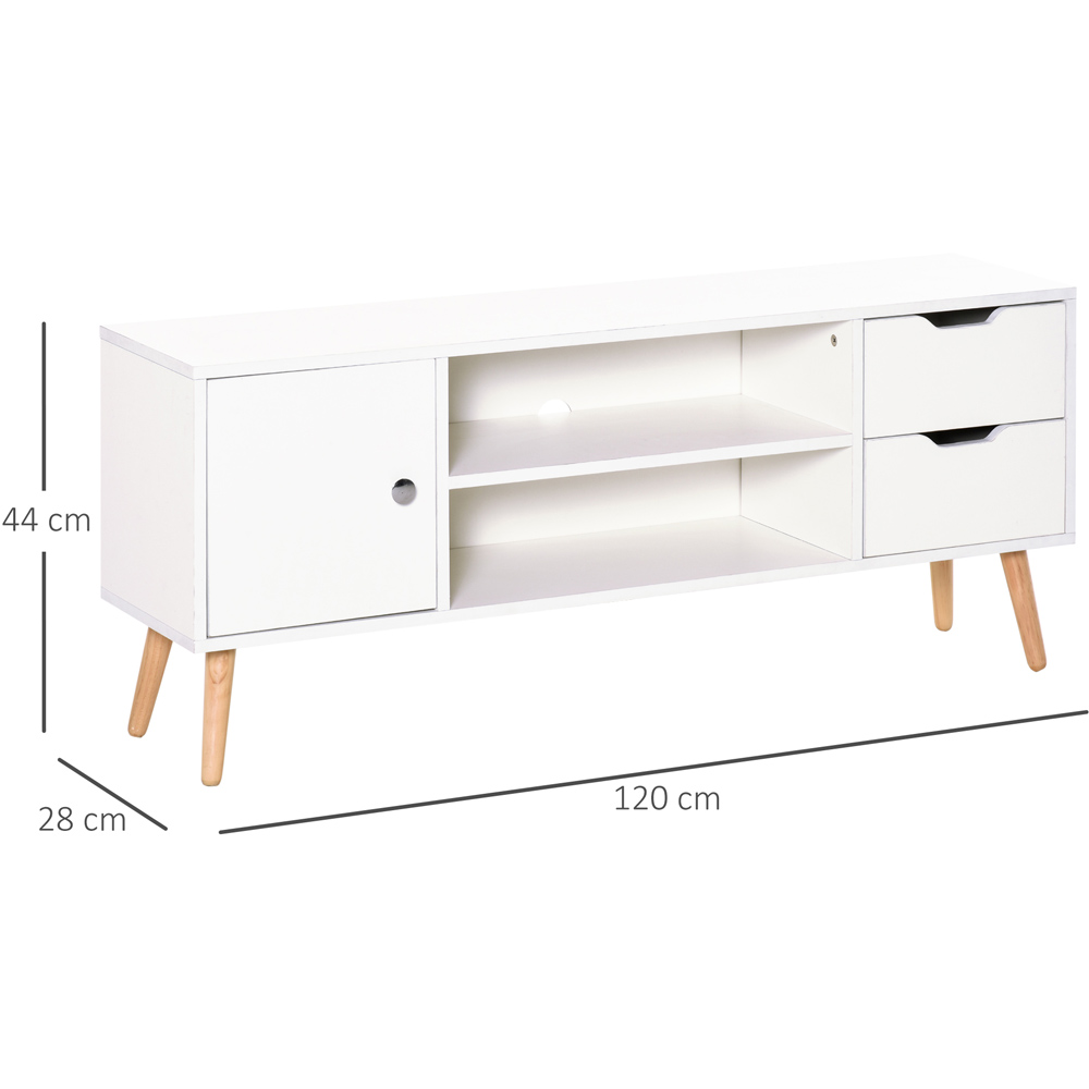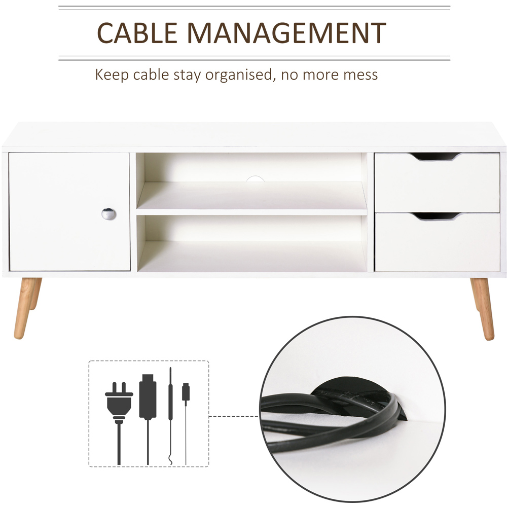 Create a stylish and modern centrepiece in your living room Portland Single Door Two Drawer White TV Unit. This Scandinavian-style TV unit is made from durable particle board, which can effortlessly hold up to 30kg of weight. It features two open compartments, two drawers and a cabinet, giving you plenty of storage room, with a cable hole to manage your wires and tidy your home. Its natural finish complements the white structure to keep the TV table balanced and stable. This TV unit is the perfect partner for entertainment and relaxation, watching your favourite show or film.