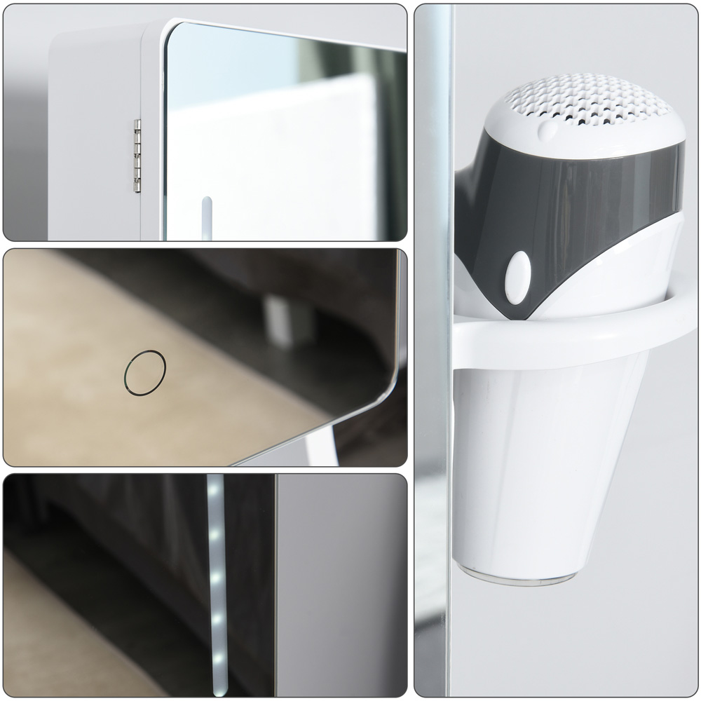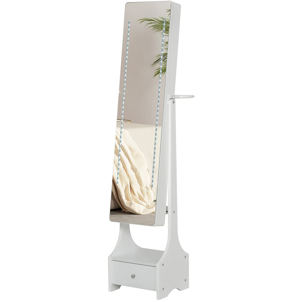 Infuse elegance and easy organisation into your everyday routine with the Portland Single Door Single Drawer White Mirrored Jewellery Cabinet with LED and Hairdryer Holder. With a long, full-length mirror and an adjustable angle, this freestanding MDF cabinet has plenty of room to store all your jewellery, cosmetics, and fragrances. The unit features 56 earring slots, 15 necklace and bracelet hooks, 77 ring slots, multiple shelves, a bottom drawer and an outside hairdryer holder, giving you lots of safe storage and holding room. It is strong and long-lasting for frequent use, and its clean white colour allows it to blend in with your house without any effort. Plus, the unit is equipped with LED lights, which glow bright with six AA batteries, making it simple to locate what you need.