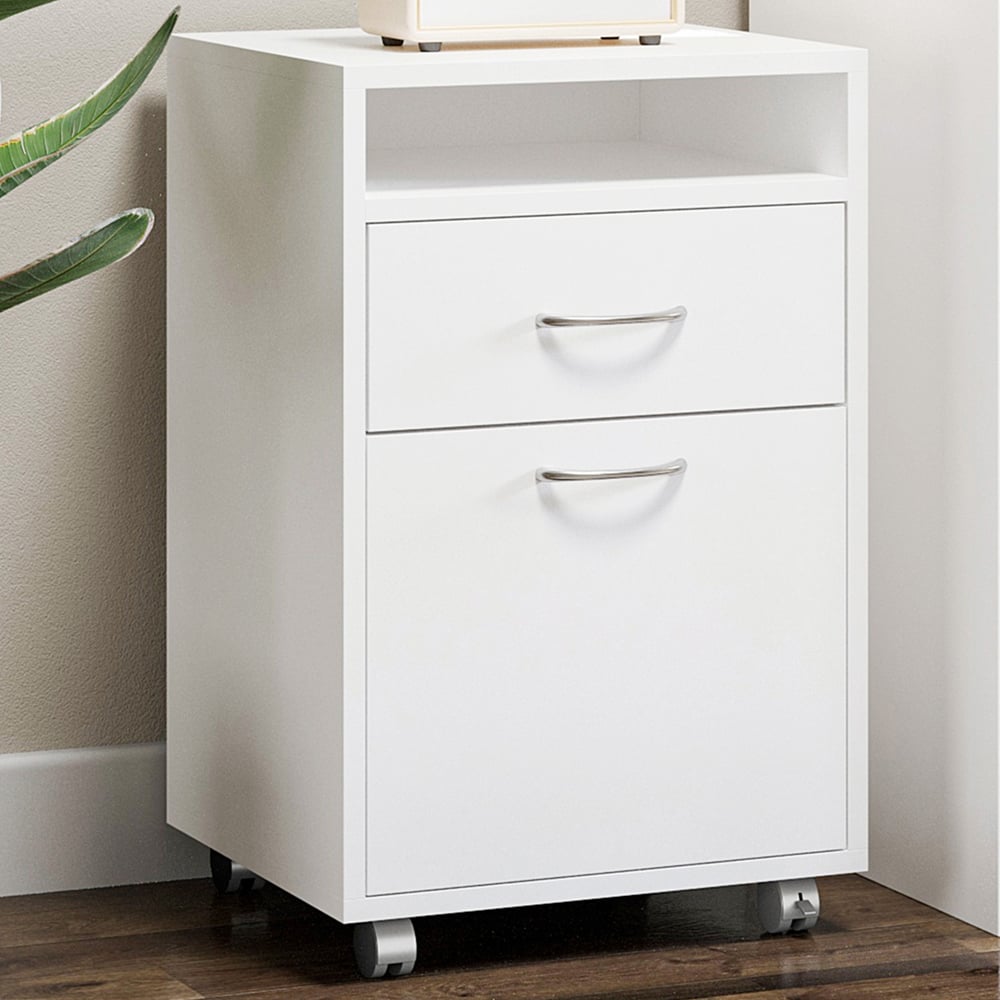 Make a versatile addition to your office or home with this Portland Single Door Single Drawer White Printer Stand. With good capacity, this printer drawer is ideal for storing filings. It also features smooth-rolling casters, offering flexible placement in the office or house. This storage cabinet with drawers is versatile and can be used anywhere. It works perfectly as a microwave or printer stand, file cabinet, linen cabinet, and end table. The stand features a shelf, large drawer, and door cabinet, providing space for paper reams, ink cartridges, books, folders, and other office supplies.
