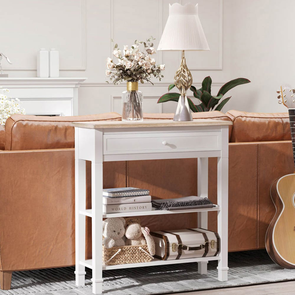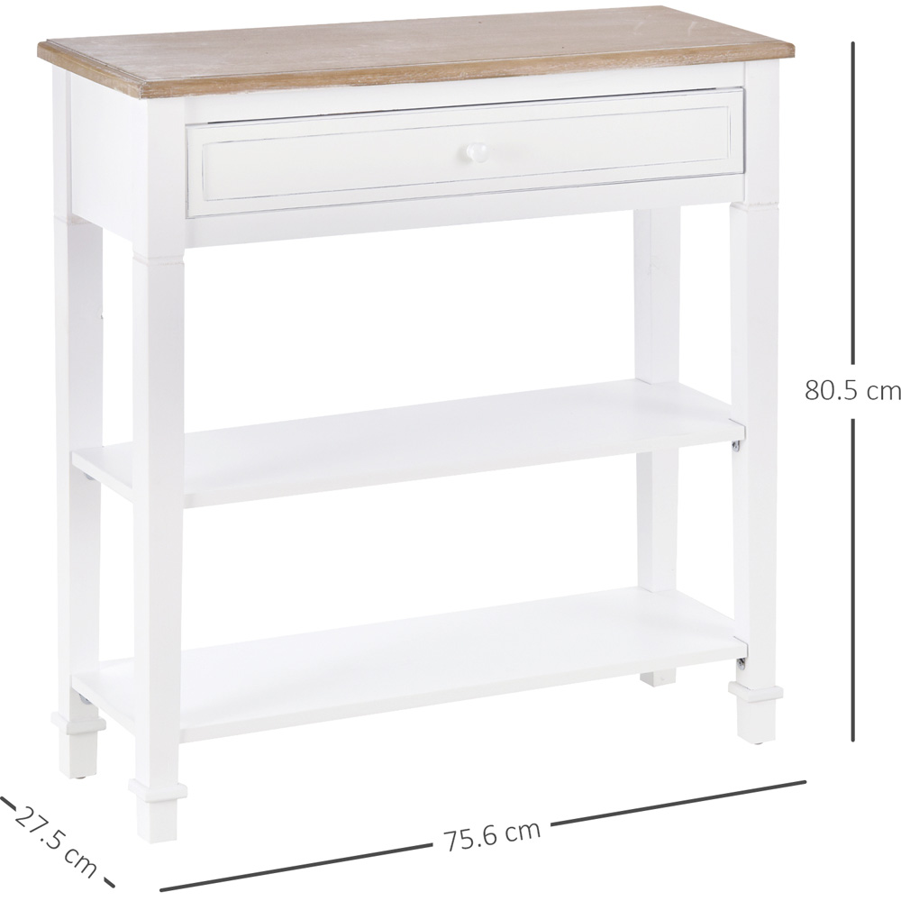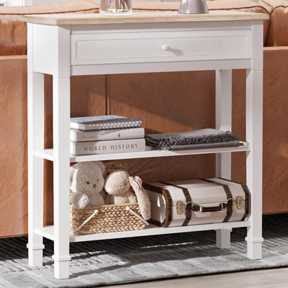 Finished in simple white, this Console Table from Portland is perfect to inject both style and practicality into your living space. Beautifully crafted to stand with pride, it features a large top drawer, two bottom shelves and an oak-tone desktop. Ideal for home hallways. Plus, the drawer has a plastic sheet at its back to prevent it from sliding out. Made of MDF board and pine wood top, it is suitable for everyday use, finished with beautiful white paint all over. Spacious in size and finished in an oak tone, it allows display room for brightening your home with flowers, frames, ornaments etc.