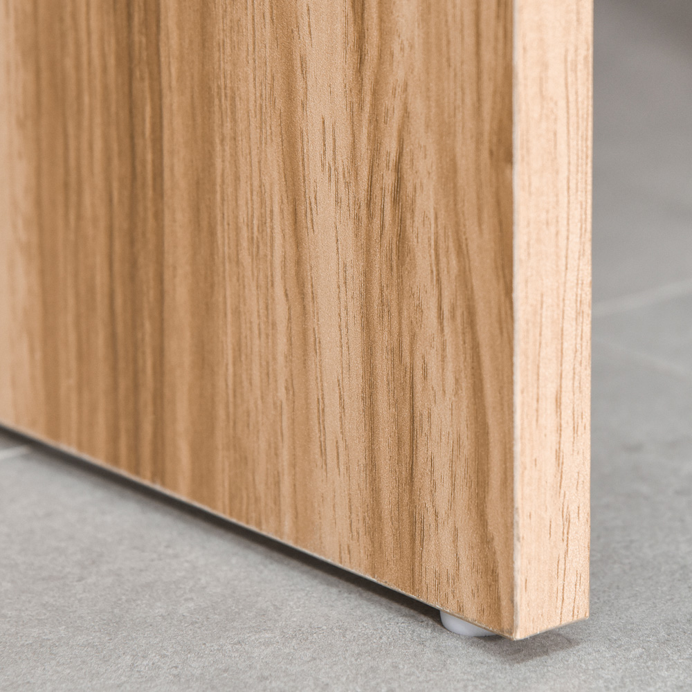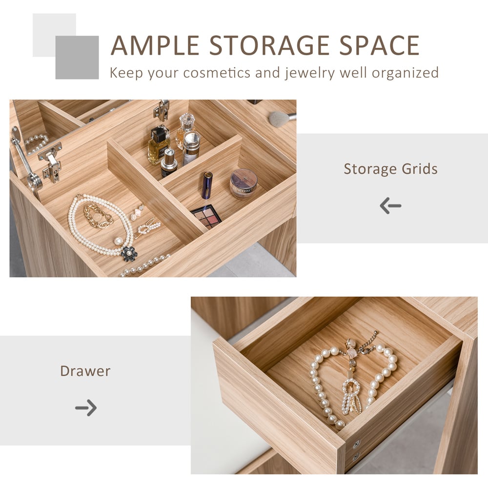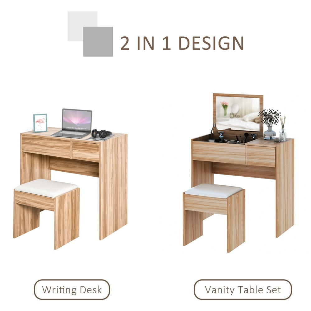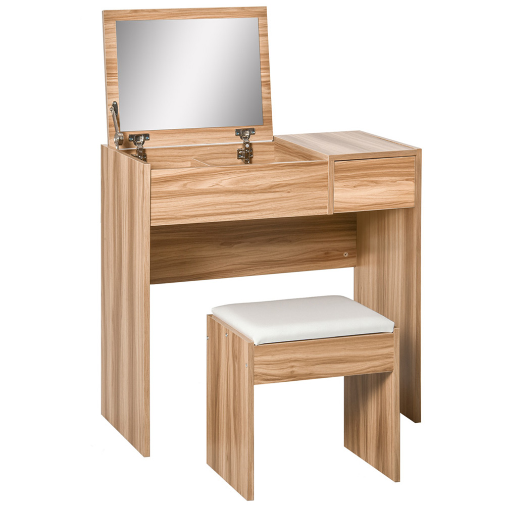 Decorate your home with this Portland Single Drawer Wood Grain Chipboard Dressing Table with Stool. This dressing table comes with a flip-top mirror that can be opened and fixed by 90° when turned up, which allows you to showcase your daily accessories, such as jewellery, makeup, and more. Once you put the lid down, this set can be transformed into a writing table or computer desk. For added comfort the set also comes with a cushioned stool and a single drawer. Add this practical and stylish item to your bedroom and enjoy your clutter-free countertop.