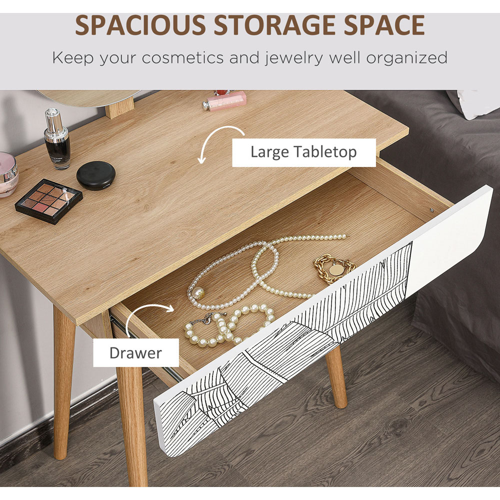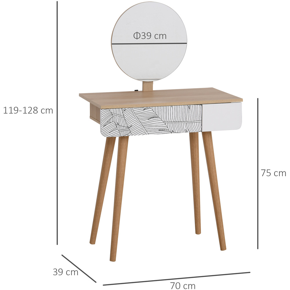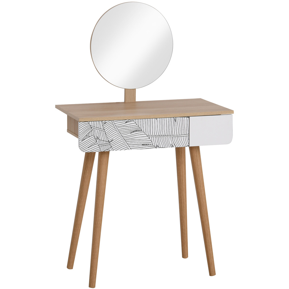Add a touch of elegance and sophistication to your daily routine with the Portland Single Drawer Wooden Oak Dressing Table with Mirror. Crafted from wood, this compact yet spacious piece features a large pull-out drawer for discreetly storing your cosmetics, toiletries, and makeup. The tabletop offers ample space for getting ready, complete with a round mirror for easy reflection. Equipped with four outward-angled legs ensures stability, while the line patterning on the drawers adds a stylish touch.