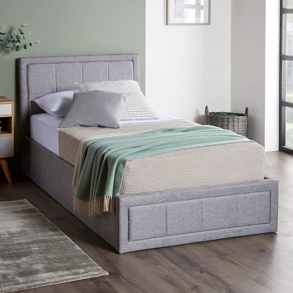 Get more out of your bed with the Portland Single Ottoman Bed with Mattress. This bed is designed to combine style and storage. Upholstered in grey hopsack linen, this ottoman storage bed frame will effortlessly blend into any bedroom interior. It creates extra space in your bedroom with a huge capacity under-bed storage compartment. This is perfect for keeping your room tidy and clutter-free. Designed with comfort in mind, this bed frame has a padded headboard, base, and sides, as well as strong sprung wooden slats for support and strength. Featuring an easy-access hydraulic dual lifting mechanism, this storage bed is made from the highest quality materials, including the strong centre support beam and upholstered frame. With a deluxe pocket-sprung mattress, this bed is also built for comfort, ensuring a good night’s sleep. This bed is also built for comfort, ensuring a good night’s sleep.