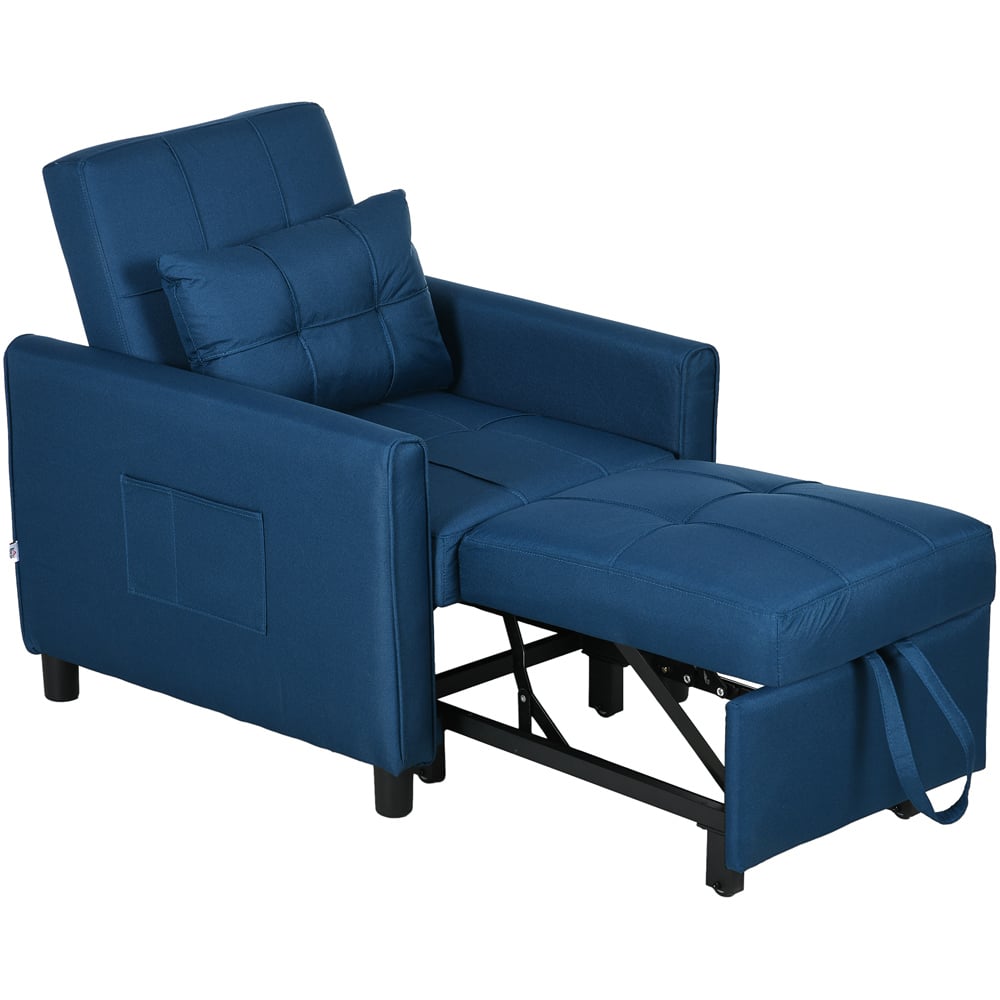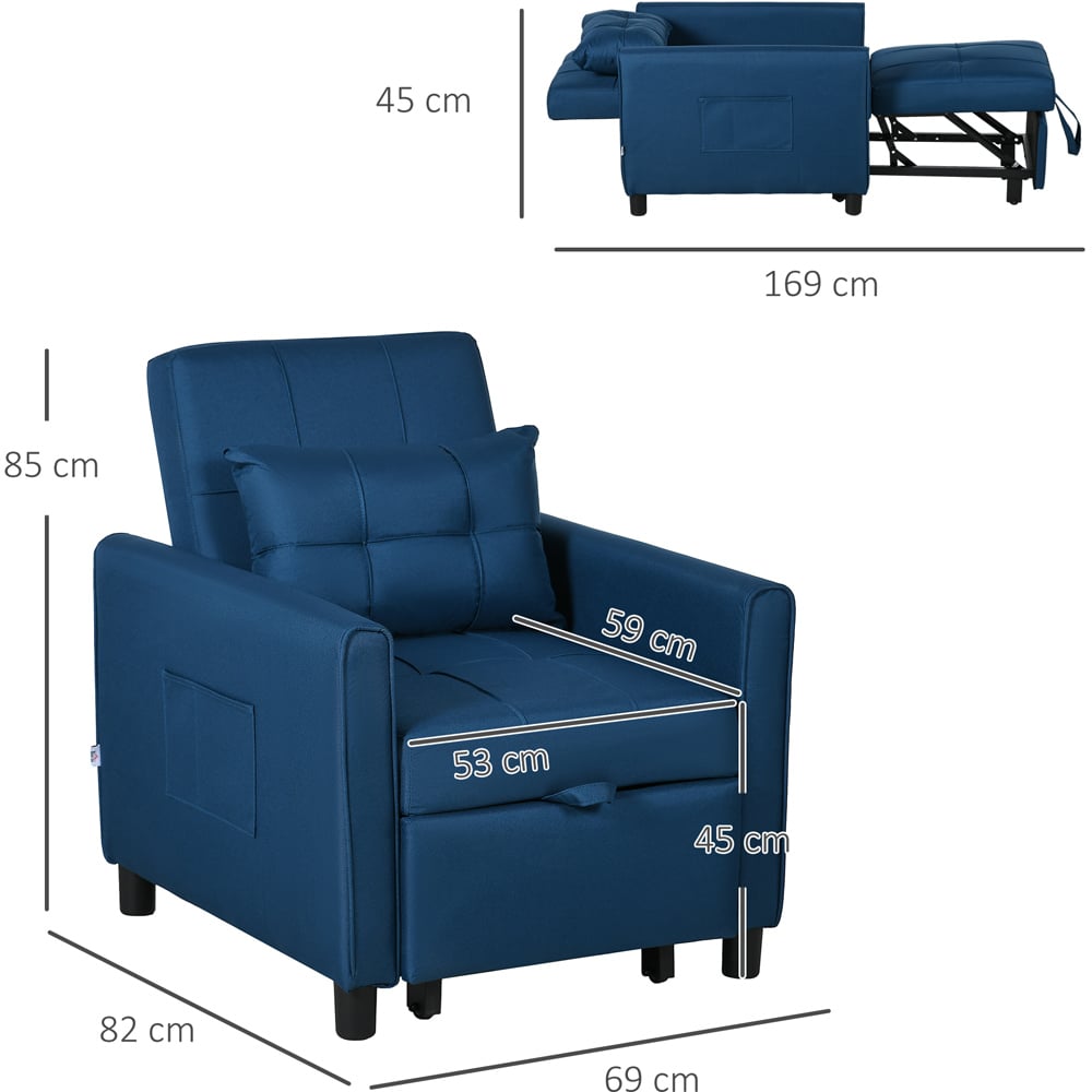 Elevate comfort and style in your space with this Portland Single Sleeper Blue Linen Touch Chair Bed. This convertible piece of furniture can be used as a chair to watch your favourite shows during the day and a single bed at night. Featuring a three-position back, the chair reclines to a maximum angle of 180° for convenient use. Also, it comes with S springs and an elastic band so you can relax for extended periods. Ideal for small flats and rooms with little space, this compact chair will fit in any space while giving you the relaxation you need. Covered in a thick padding, it is sure to provide optimum comfort. Moreover, it comes complete with two side pockets to store handy essentials like remotes, books and more.