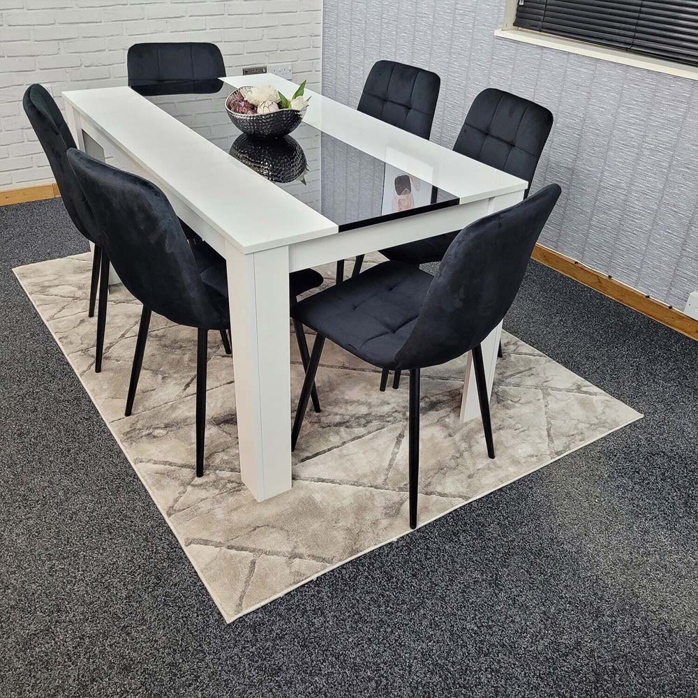 Indulge in luxurious dining with this Portland Velvet and Wood 6 Seater Dining Set White and Black. This dinner set has six tufted velvet black Rocco chairs with slightly curved back design. The table features a stunning white wooden surface with a striking black stripe painted in high UV painting. It is crafted with high-quality MDF to ensure a durable, long-lasting tabletop. The dining chairs are made of premium velvet with metal chair legs. Also, the legs prevent damage with the adjustable foot protection provided. It has a straightforward assembly and is supported by clear instructions for this dining set. The dining chairs' dimensions are H87 x W44 x L59cm, and the dining table's dimensions are H75 x W80 x L140cm. The seat height of the chair is 45cm.
