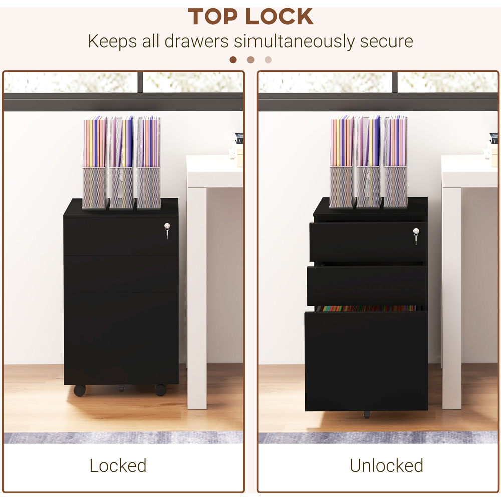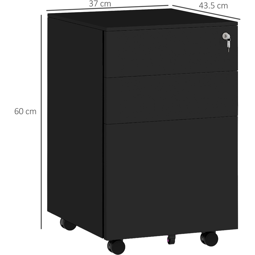 Keep files organised with the Portland Vinsetto Black 3 Drawer Vertical Filing Cabinet. It provides convenient and secure storage for your office. Constructed from steel, this filing cabinet is durable and reliable for daily use, ensuring the safety of your important documents. The cabinet features two small drawers and a large bottom drawer, allowing you to keep your files organised. The top lock ensures that all drawers are securely locked, providing peace of mind when you are not present. Two keys are included for added security.