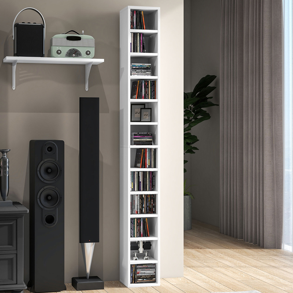 Add a classy and functional touch to your home decor with the Portland White 12 Cube CD and DVD Storage Unit. This multifunctional unit is ideal for storing up to 204 CDs or DVDs according to your preference. It is crafted using a sturdy material for durability and longevity. It features a tall and slim design that makes it a space-saving unit. This storage unit has an anti-tipping design with a sturdy base for stability and support.