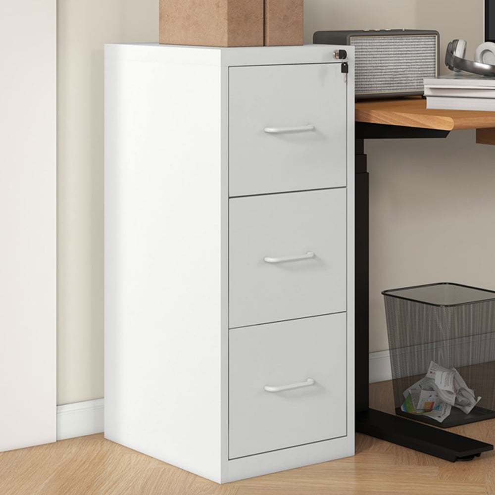 Keep your workspace tidy and organised with this Portland White 3 Drawer Steel Filing Cabinet. It features two drawers with adjustable bars for A4 and letter-size files and provides plenty of room for keeping paperwork together. The top centre-locking system ensures locks all drawers simultaneously for security. Each drawer of the lockable filing cabinet has an adjustable bar to hang A4 and letter-size folders. Features a central-locking mechanism with the top lock that secures all drawers, so you keep important pieces safe when inside home office cabinet, also two keys are included. This metal filing cabinet is a tough piece and suitable for everyday use. It is easy to wipe clean and comes with foot pads to gently protect the floor.