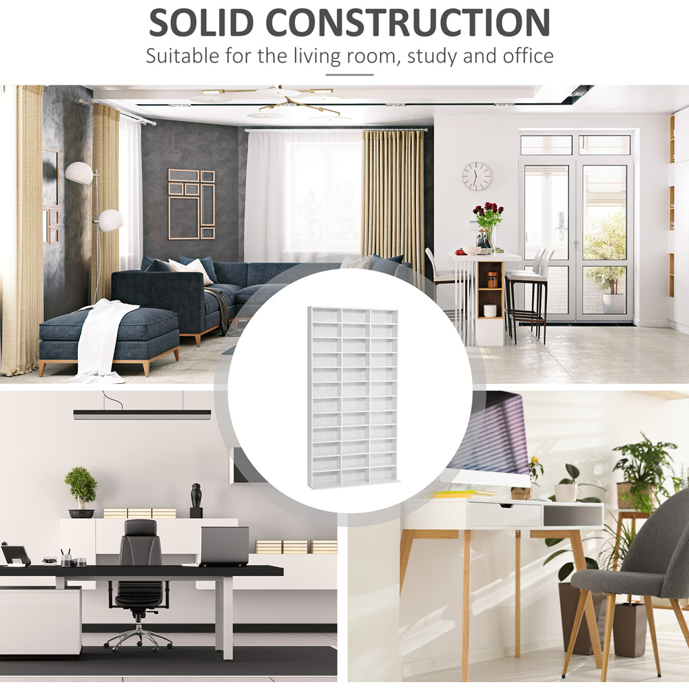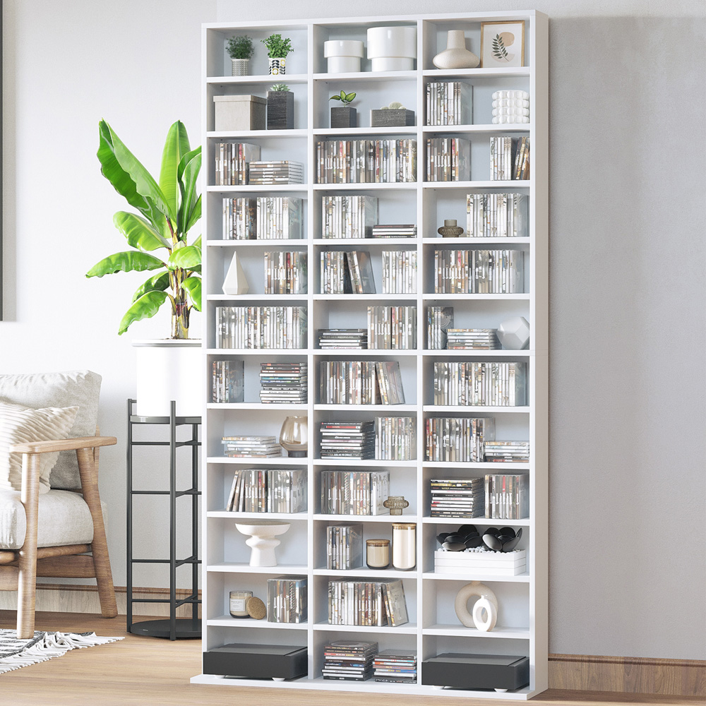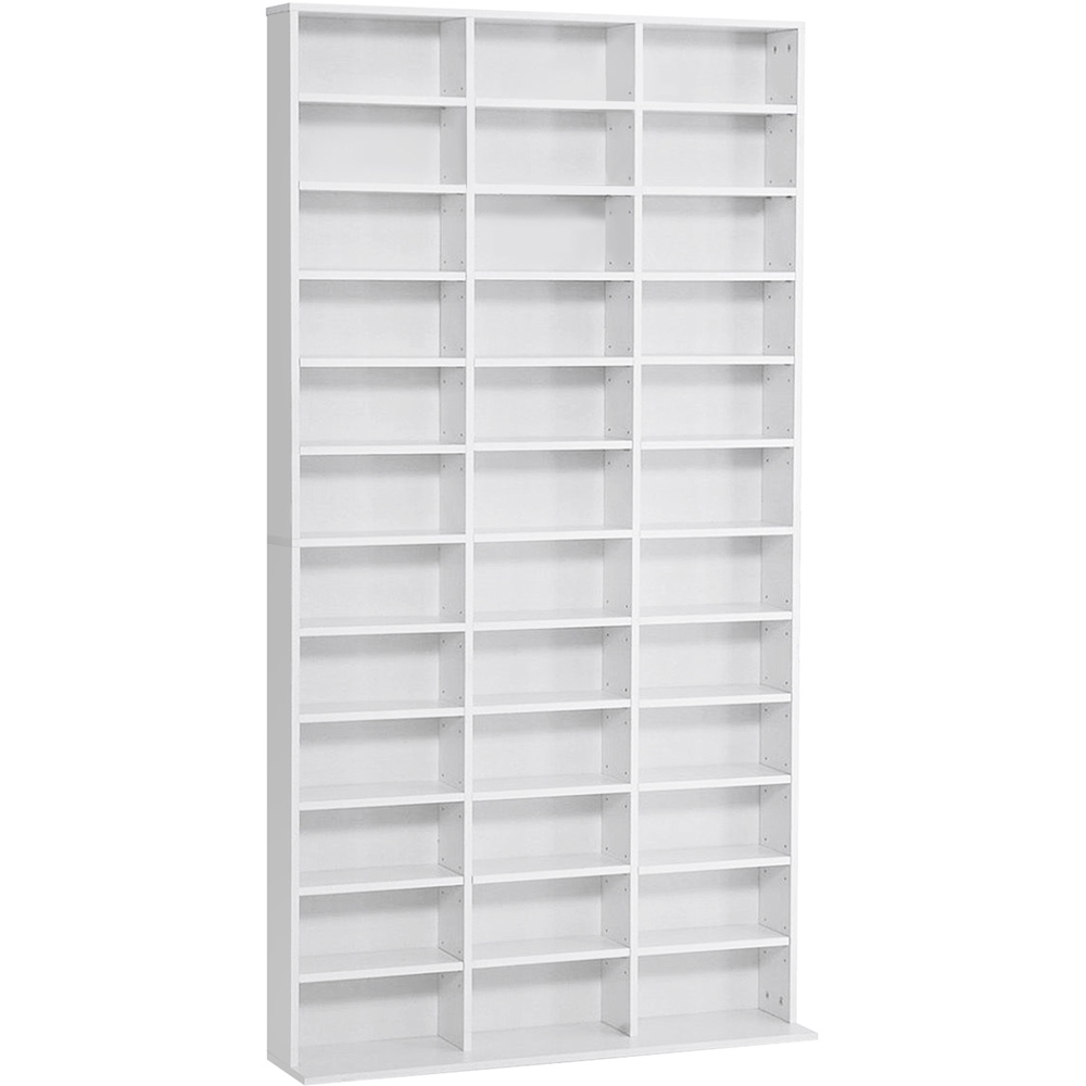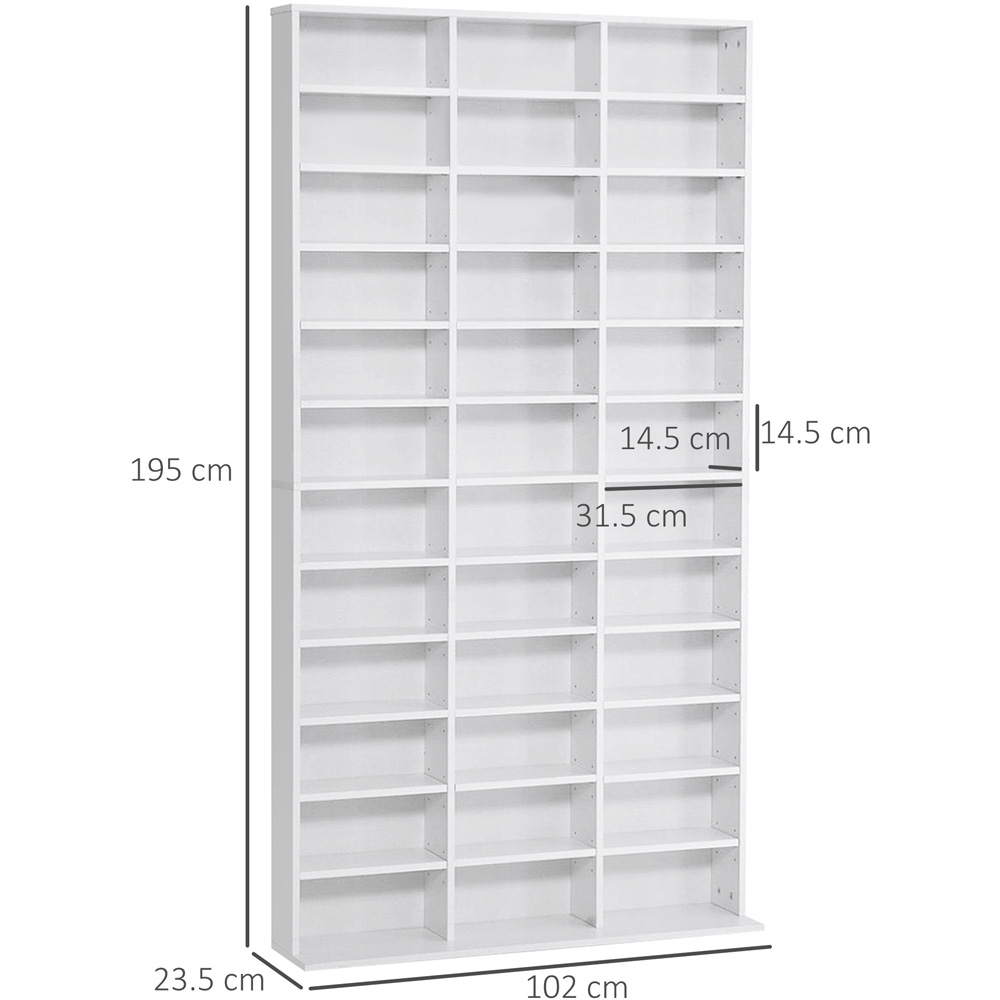 Organise CDs and DVDs neatly with the Portland White CD and DVD Storage Unit. With adjustable partition boards, you can customise the height to accommodate your storage needs. The 33 height-adjustable compartments allow you to arrange the shelves according to your preferences. This modern and practical furniture piece will complement any room. Rest assured that your media products will be secure on the sturdy base of this shelf. It offers a large storage space, capable of holding up to 1116 CDs or 528 DVDs. Dimensions: 102 x 24 x 195cm.