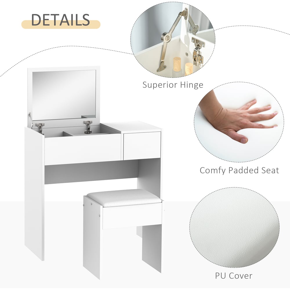 Transform your bedroom decor with a touch of sophistication and practicality with the Portland White Dressing Table Set with Stool. This multi-purpose dressing table set features a flip-up design that allows you to easily convert the dressing table with a mirror to an ideal writing desk. The hidden space under the lid and a slide-out drawer offer lots of storage space, enabling you to organise your items neatly. The cushioned stool adds extra comfort.