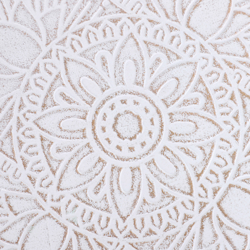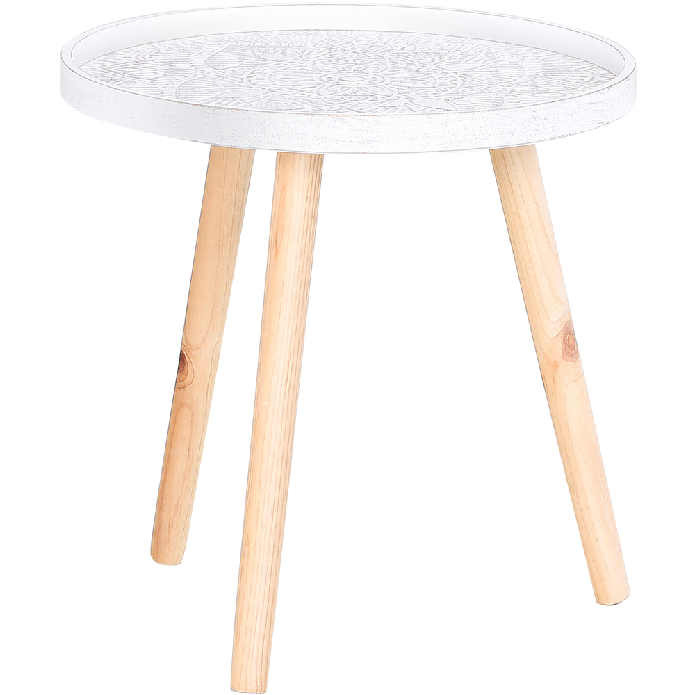 Add style to your space with the Portland White Flower Eteched Side Table. Great placed all over the home - your living room, bedroom, balcony and hallway. With a lovely flower design, the round coffee table creates a subtly striking look for an elegant touch all day long. Shallow yet spacious, the living room table provides a place to keep cups, books, magazines, keys and anything else on and close to you. Also, with raised edges, it prevents items from falling off onto the floor.