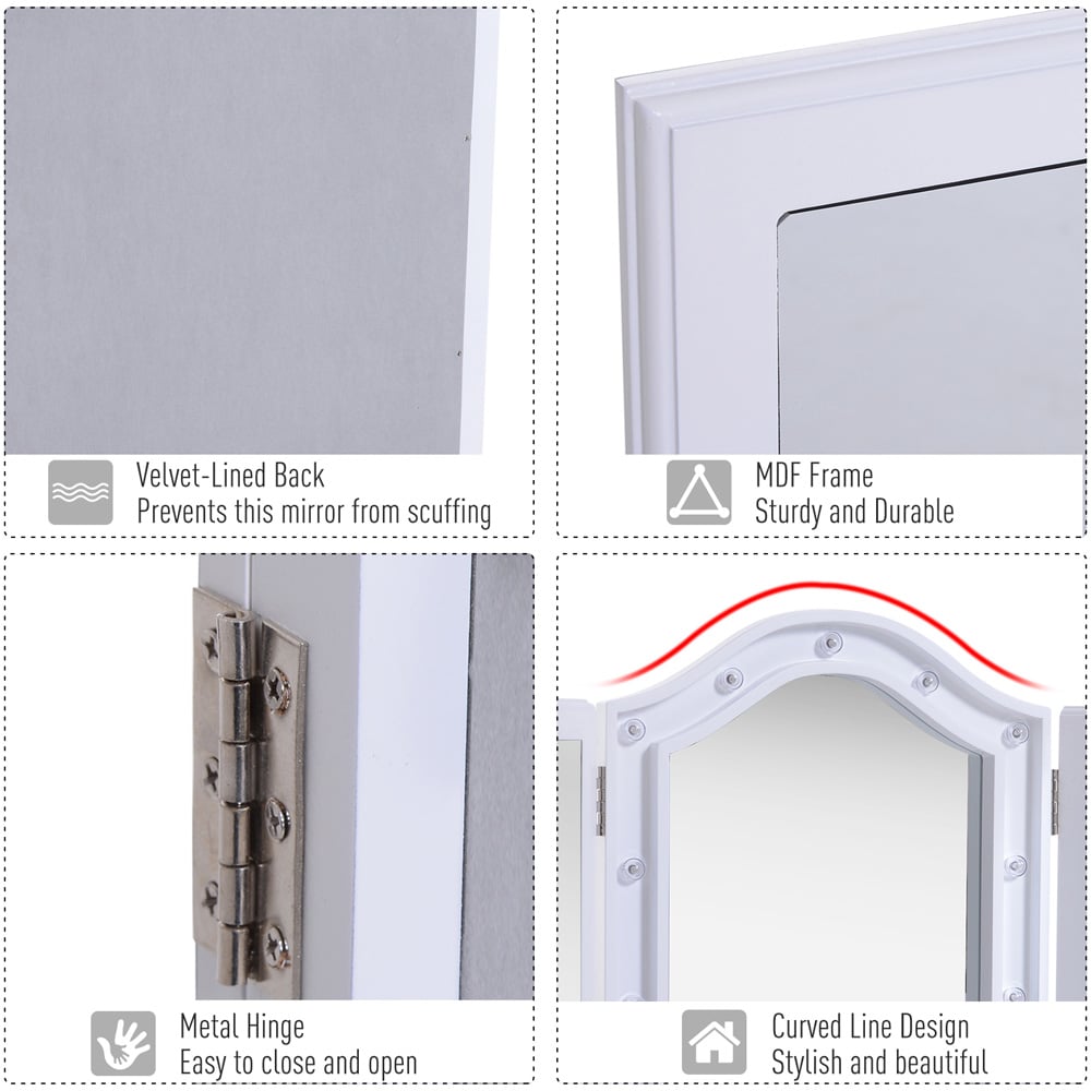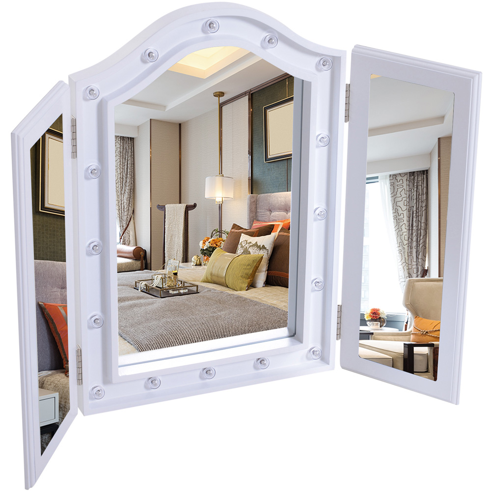 Make a beautiful addition to your living space with this Portland White LED Trifold Freestanding Mirror. This tri-fold table mirror has an MDF frame and is a glamorous way for you to get ready, day and night. Inspired by Hollywood dressing rooms, the middle mirror features 16 LED lights illuminating your face as you get ready. There's a hinged end mirror on both sides, allowing you to position at any angle. They also fold inwards when not used to protect the glass against dirt and scratches.