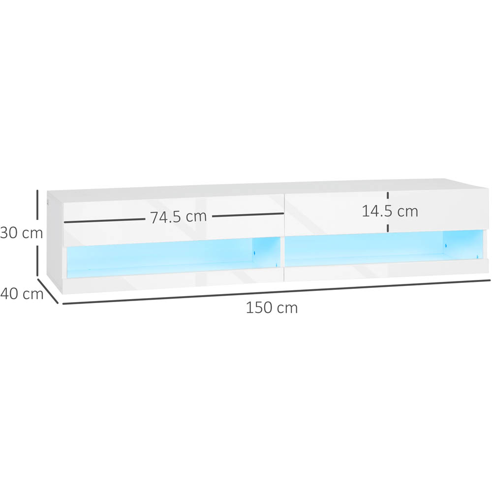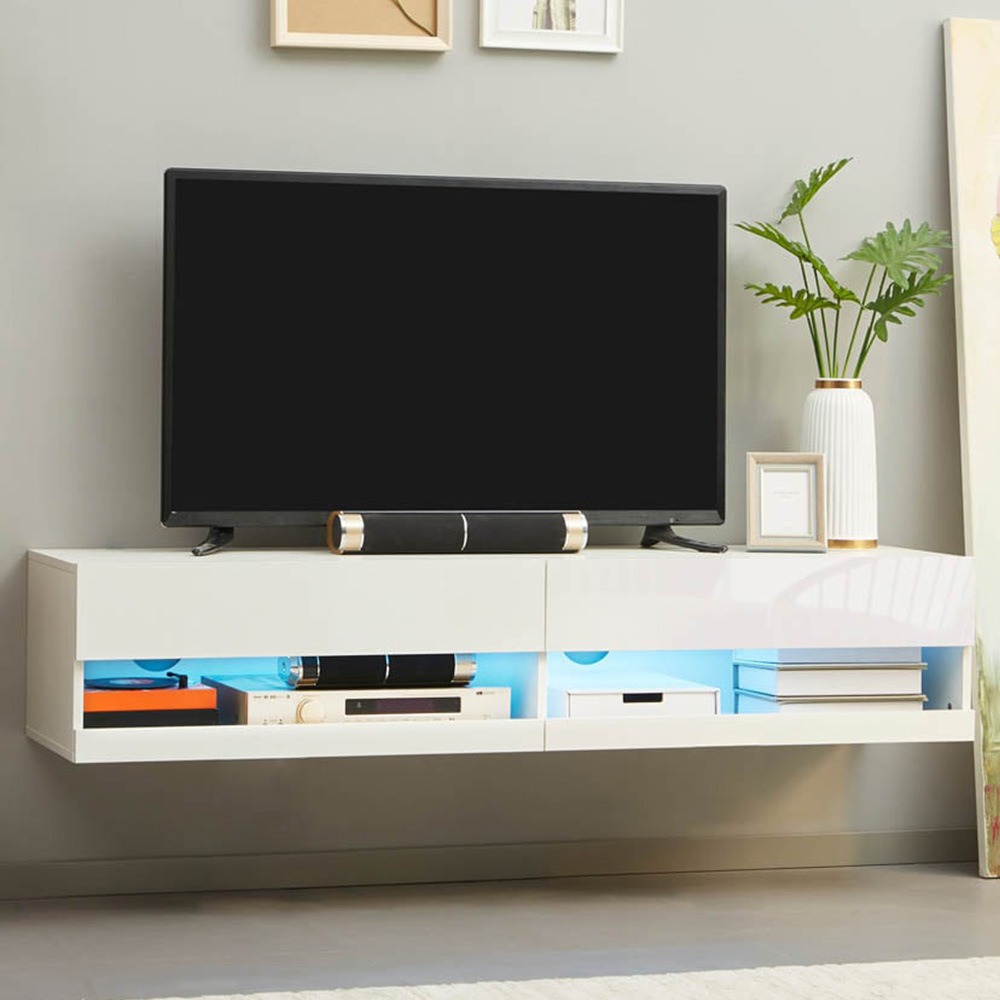 Set the perfect mood while watching a movie with this Portland White Wall Mounted TV Unit Cabinet. Featuring 16 coloured LED lights with four modes, you can easily change the colour and adjust the brightness using the included remote to suit your mood! It features two storage shelves an easy way to keep devices, consoles and more stored while the two upper doors for full access to the TV unit. It has a large tabletop suitable for screens up to 65 inches along with two cables for organising wires. Sleek and stylish, this entertainment unit with a high gloss finish is a contemporary addition suitable for any living space.
