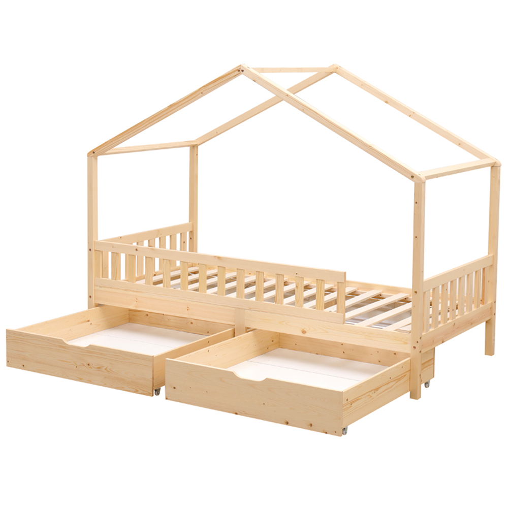 Fashion and elegant Scandinavian style, the appearance of the house, highlight the uniqueness of the room, also can decorate the top of the bed with colourful pendants or led lights, create the perfect princess or prince room. With 2 drawers at the bottom of the bed, enough space to store toys and other things, make the room more tidy and clean. Frame made of solid pine wood and MDF, strong and stable. The bed is surrounded by a fence made of MDF to better protection. The drawers on the wheels and can be easily pulled out from under the bed. Overall Size: L196 × W96 × H149 CM Mattress(WITHOUT): W90 × L190 CM Material: Pine Wood and MDF Packaging: This item is flat packed, include 2 packages, and requires self-assembly, but with detailed instructions.