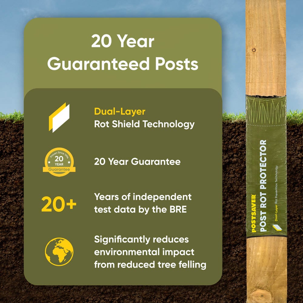 Postsaver rot-protected and UC4-treated posts are the perfect solution to a long-lasting, high-quality fence that won’t cause stress and hassle down the line. Each post is made from high-quality timber and covered by a 20-year post-replacement guarantee, thanks to Postsaver rot protection being pre-applied. Postsaver’s dual-layer rot prevention technology is the proven solution against ground-line post rot. It works by creating an air and watertight seal around the post's surface, which locks out all the factors required for wood decay: fungi, oxygen, and moisture. Deeper in the ground, there is not enough oxygen for the fungi to survive, so there is no need to protect this part of the post. The 20-year post-replacement guarantee includes rot protection applied for a 2ft (30cm) post-burial depth. Posts can be installed in all the usual methods and are fully compatible with fence post concrete, backfill, and power-driving.