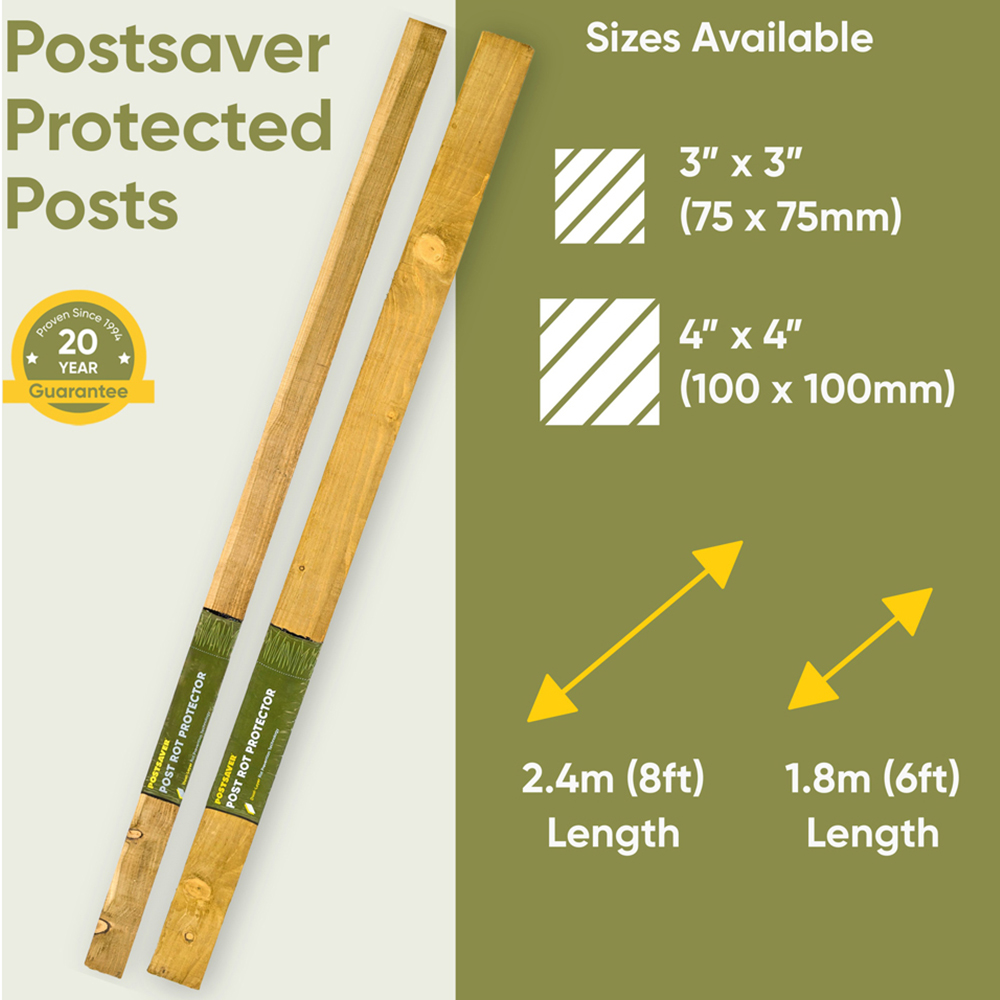 Postsaver rot-protected and UC4-treated posts are the perfect solution to a long-lasting, high-quality fence that won’t cause stress and hassle down the line. Each post is made from high-quality timber and covered by a 20-year post-replacement guarantee, thanks to Postsaver rot protection being pre-applied. Postsaver’s dual-layer rot prevention technology is the proven solution against ground-line post rot. It works by creating an air and watertight seal around the post's surface, which locks out all the factors required for wood decay: fungi, oxygen, and moisture. Deeper in the ground, there is not enough oxygen for the fungi to survive, so there is no need to protect this part of the post. The 20-year post-replacement guarantee includes rot protection applied for a 2ft (30cm) post-burial depth. Posts can be installed in all the usual methods and are fully compatible with fence post concrete, backfill, and power-driving.