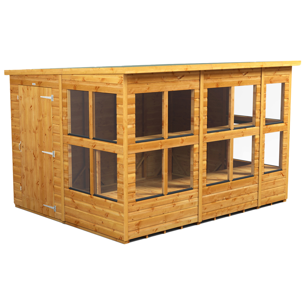 Designed for easy self-assembly, the Power 10 x 8ft Pent Potting Shed can be installed how you want by allowing you to place the door and windows in any position. The door can be placed in any position on any side, which you can choose as you're assembling the building. This is a premium-quality shed with high-grade timber. Each building is dip treated using a special formula wood preserver, with a wax additive allowing you to go a whole year without the need to re-treat your garden building. Each component is dip treated by submerging it into the treatment ensuring it is thoroughly coated before being removed and dried. Each potting shed also comes with two-tiered staging units designed to fit perfectly against the framing of the building, providing valuable shelf space for tools, plants and more!