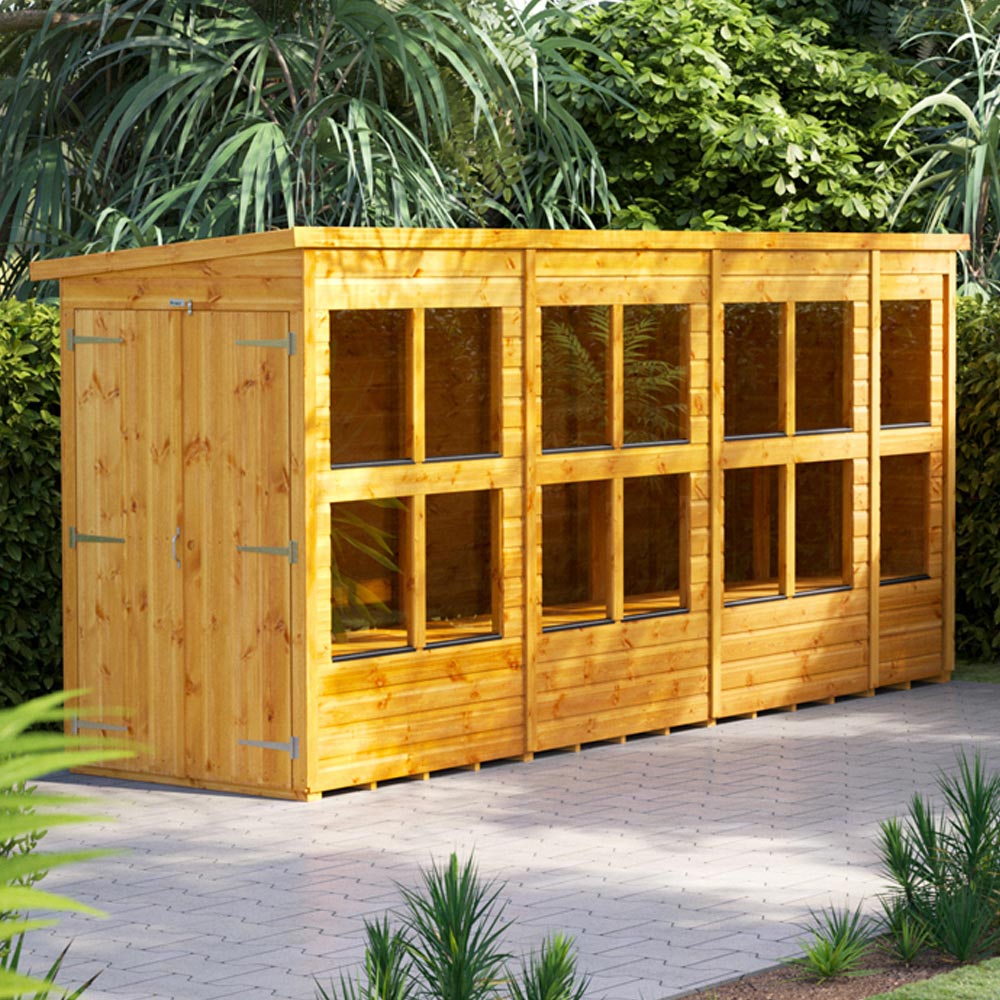 Designed for easy self-assembly, the Power 14 x 4ft Pent Double Door Potting Shed can be installed how you want by allowing you to place the door and windows in any position. The door can be placed in any position on any side, which you can choose as you're assembling the building. This is a premium-quality shed with high-grade timber. Each building is dip treated using a special formula wood preserver, with a wax additive allowing you to go a whole year without the need to re-treat your garden building. Each component is dip treated by submerging it into the treatment ensuring it is thoroughly coated before being removed and dried. Each potting shed also comes also comes with two-tiered staging units designed to fit perfectly against the framing of the building, providing valuable shelf space for tools, plants and more!