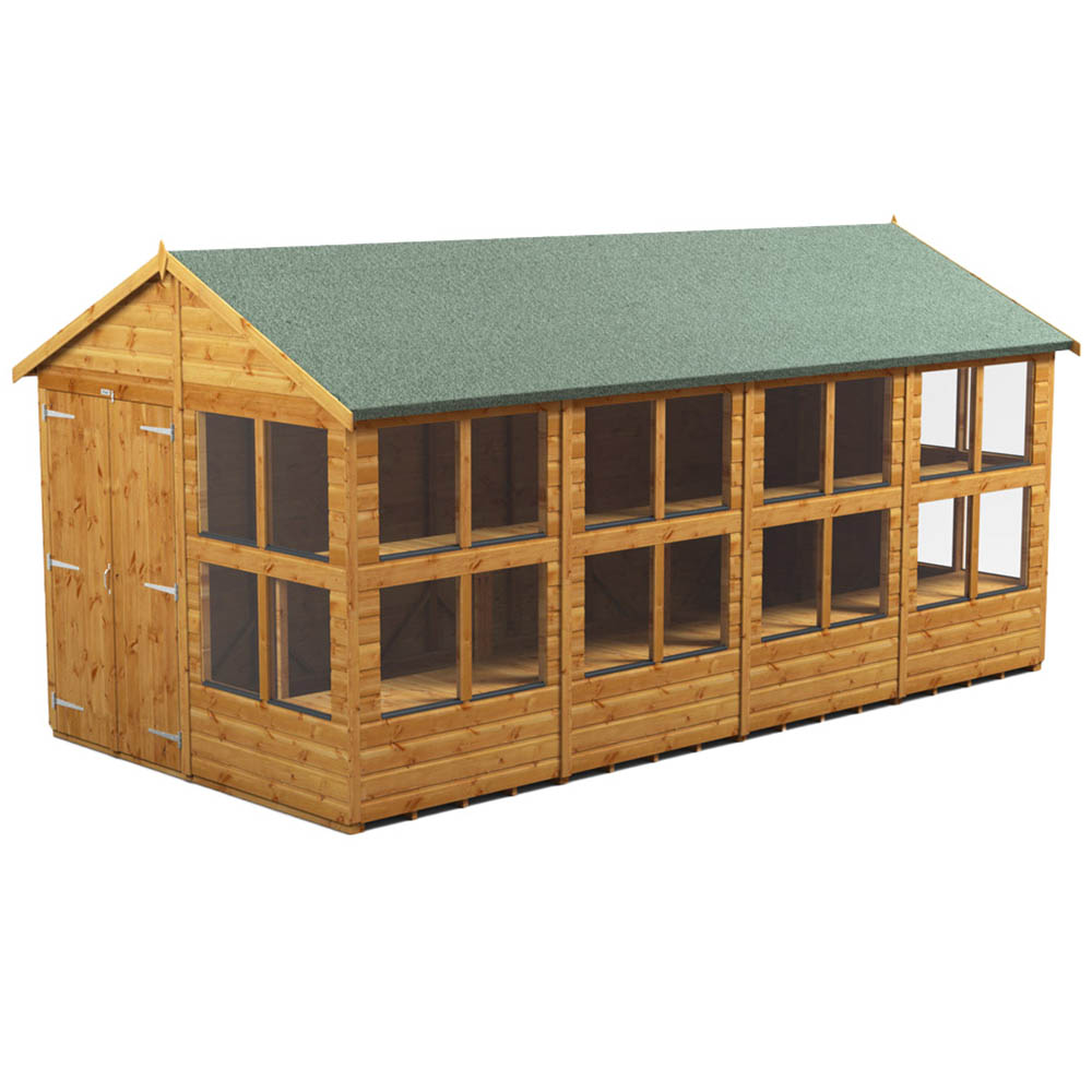 Designed for easy self-assembly, the Power 16 x 8ft Apex Potting Shed with Double Doors can be installed how you want by allowing you to place the door and windows in any position. The door can be placed in any position on any side, which you can choose as you're assembling the building. Featuring toughened glass security windows, this is a premium quality shed with high-grade timber sourced from the finest Scandinavian forests. Each building is dip treated using a special formula wood preserver, with a wax additive allowing you to go a whole year without the need to re-treat your garden building. Each component is dip treated by submerging it into the treatment ensuring it is thoroughly coated before being removed and dried. Finished with a five-pin security lock, the shed also comes with two-tiered staging units designed to fit perfectly against the framing of the building, providing valuable shelf space for tools, plants and more!