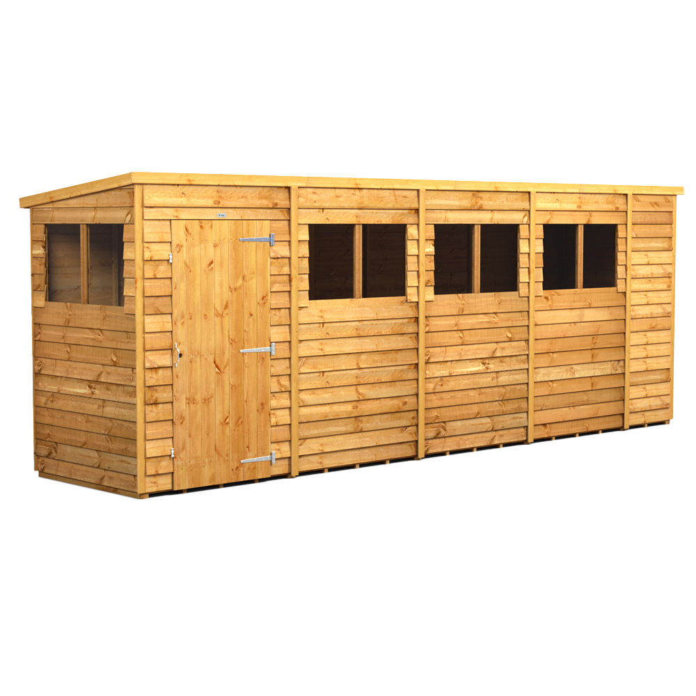 Designed for easy self-assembly, the Power 18 x 4ft Overlap Pent Garden Shed can be installed how you want by allowing you to place the door and windows in any position. The door can be placed in any position on any side, which you can choose as you're assembling the building. Modular design with rustic cladding, this is a premium-quality shed with high-grade timber. Each building is dip treated using a special formula wood preserver, with a wax additive allowing you to go a whole year without the need to re-treat your garden building. Each component is dip treated by submerging it into the treatment ensuring it is thoroughly coated before being removed and dried.