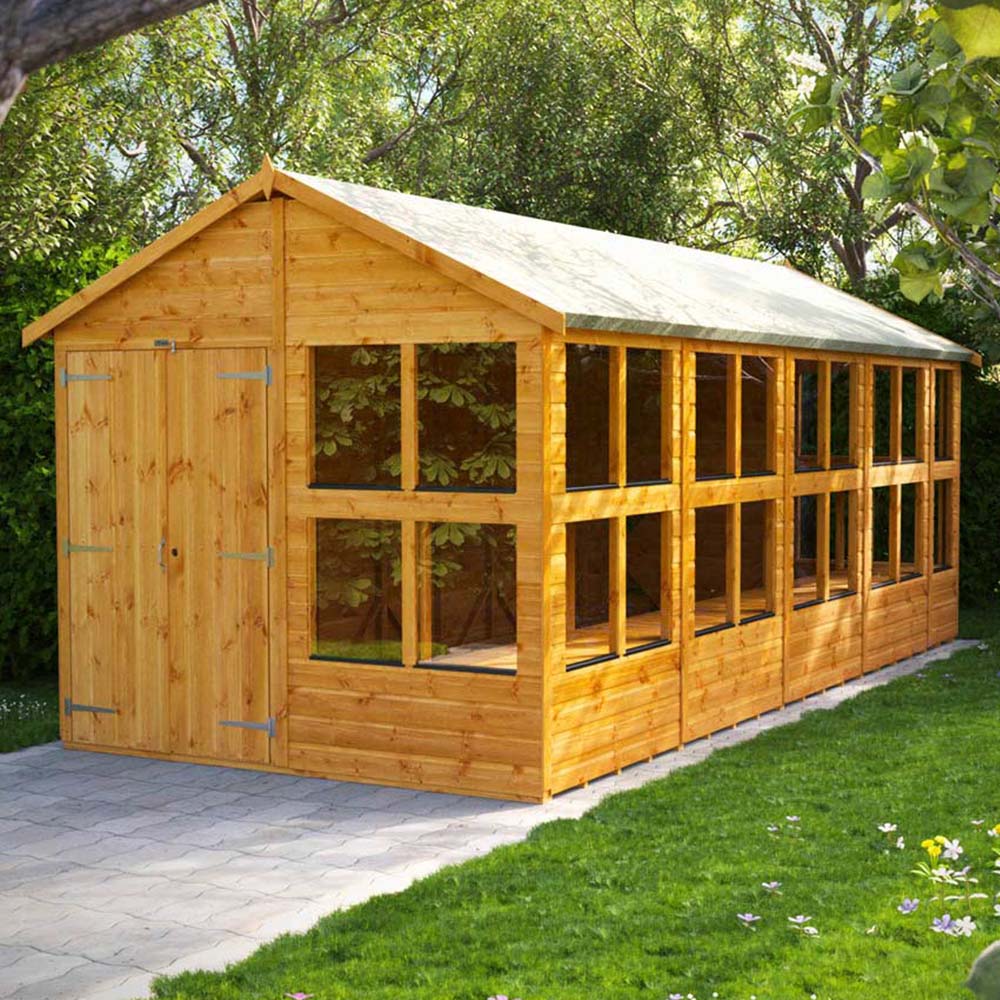 Designed for easy self-assembly, the Power 18 x 8ft Apex Potting Shed with Double Doors can be installed how you want by allowing you to place the door and windows in any position. The door can be placed in any position on any side, which you can choose as you're assembling the building. Featuring toughened glass security windows, this is a premium quality shed with high-grade timber sourced from the finest Scandinavian forests. Each building is dip treated using a special formula wood preserver, with a wax additive allowing you to go a whole year without the need to re-treat your garden building. Each component is dip treated by submerging it into the treatment ensuring it is thoroughly coated before being removed and dried. Finished with a five-pin security lock, the shed also comes with two-tiered staging units designed to fit perfectly against the framing of the building, providing valuable shelf space for tools, plants and more!