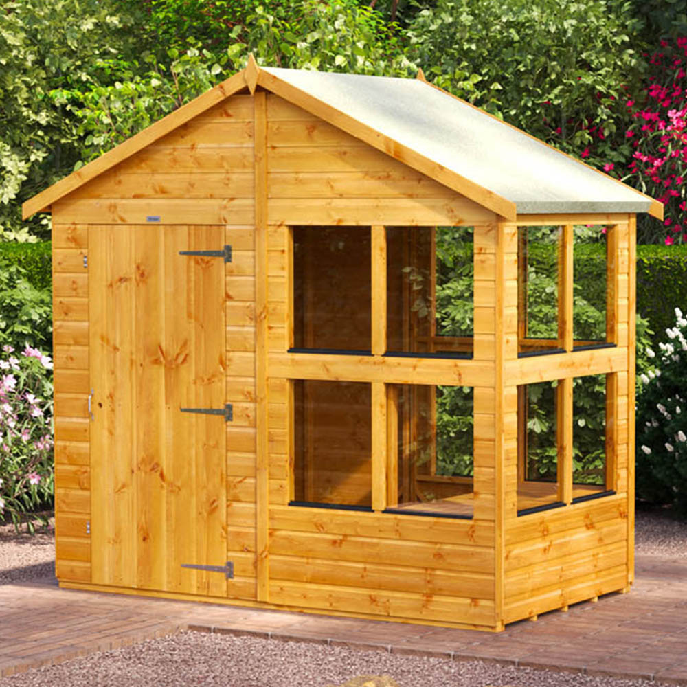 Designed for easy self-assembly, the 4 x 8ft Power Apex Potting Shed can be installed how you want by allowing you to place the door and windows in any position. The door can be placed in any position on any side, which you can choose as you're assembling the building. Featuring toughened glass windows, this is a premium quality shed with high-grade timber sourced from the finest Scandinavian forests. Each building is dip treated using a special formula wood preserver, with a wax additive allowing you to go a whole year without the need to re-treat your garden building. Each component is dip treated by submerging it into the treatment ensuring it is thoroughly coated before being removed and dried. Finished with a 5-pin cylinder lock for security, the shed also comes with two-tiered staging units designed to fit perfectly against the framing of the building, providing valuable shelf space for tools, plants and more!