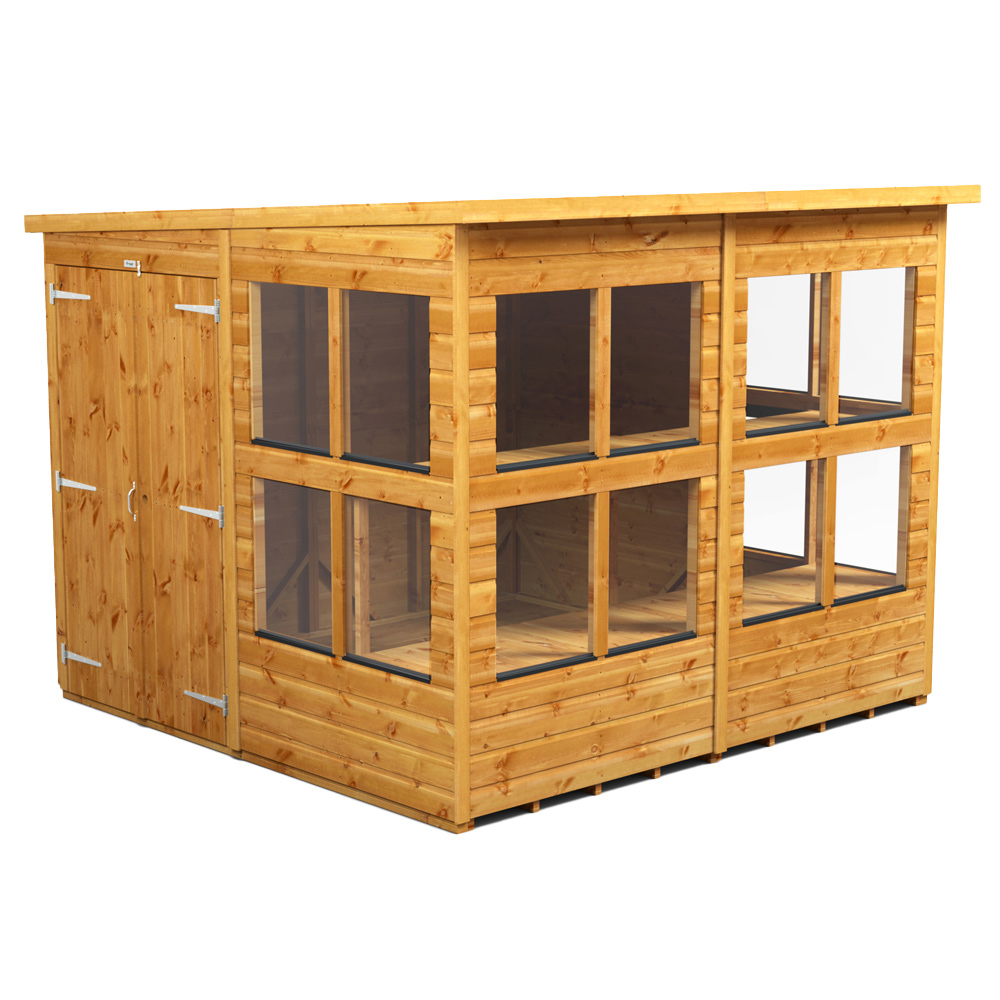 Designed for easy self-assembly, the Power 8 x 8ft Pent Double Door Potting Shed can be installed how you want by allowing you to place the door and windows in any position. The door can be placed in any position on any side, which you can choose as you're assembling the building. This is a premium-quality shed with high-grade timber. Each building is dip treated using a special formula wood preserver, with a wax additive allowing you to go a whole year without the need to re-treat your garden building. Each component is dip treated by submerging it into the treatment ensuring it is thoroughly coated before being removed and dried. Each potting shed also comes also comes with two-tiered staging units designed to fit perfectly against the framing of the building, providing valuable shelf space for tools, plants and more!
