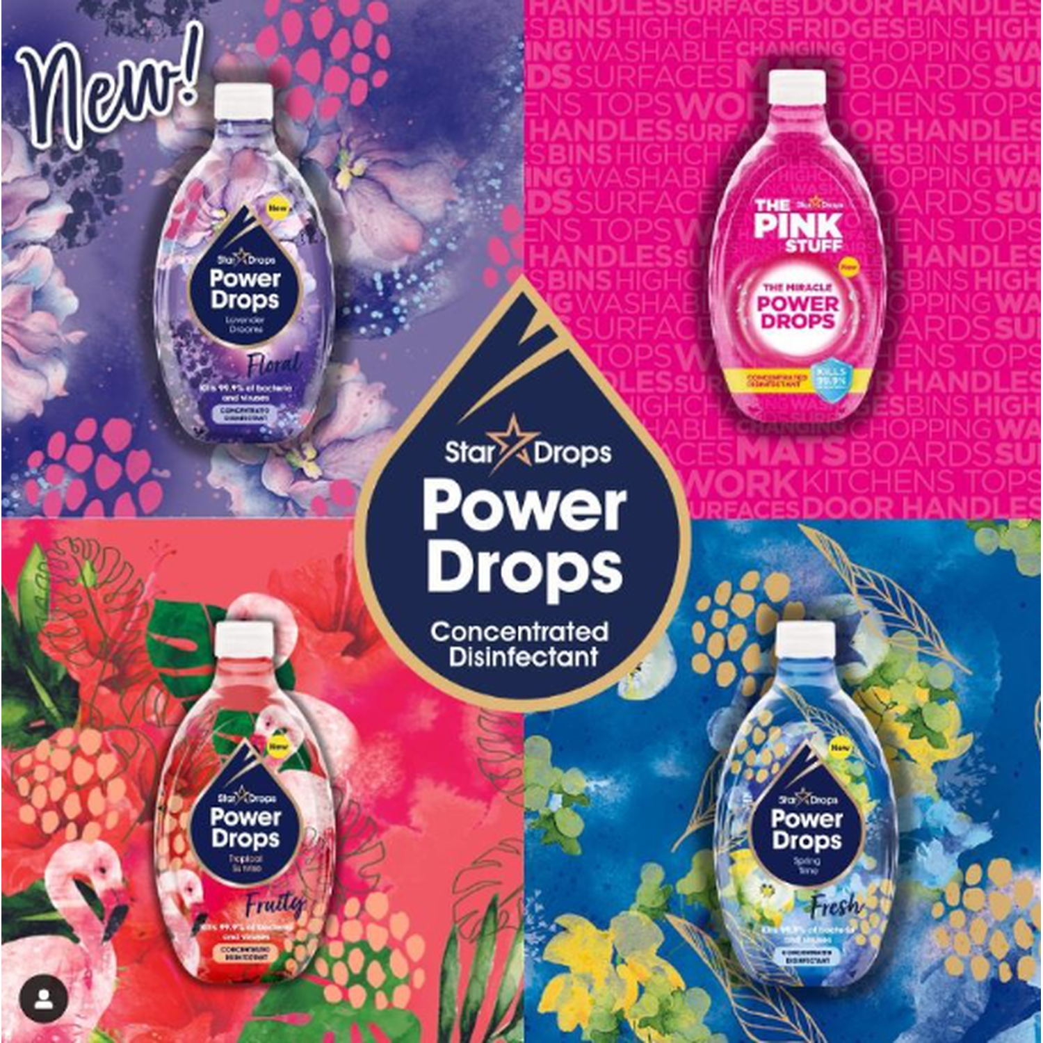 Power Drops Concentrated Disinfectant 250ml has been formulated to be ideal for the cleaning and disinfection of washable and sealed surfaces around the home. This concentrated disinfectant has all of Stardrops famous cleaning power and leaves behind a lovely fresh scent. Available in fruity, fresh. floral or The Pink Stuff.