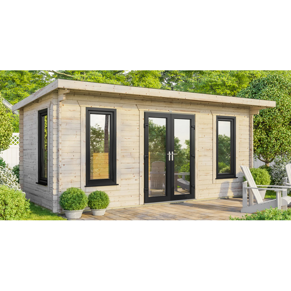 Make a practical and stylish addition to your outdoor space with the Power Sheds 20 x 10ft Centre Door Pent Log Cabin. It is built with 44mm thick high-grade timber walls, ensuring durability and strength. The cabin features uPVC double doors and 'Tilt and Turn' opening windows in anthracite grey, providing both security and insulation. The toughened double glazing and 5-point locking mechanism further enhance the safety of the cabin. The roof of the cabin has a 50-year life expectancy, thanks to the EPDM rubber roofing system and gutter edge drip plate that ensures long-lasting protection against the elements. Additionally, the cabin is designed to be under 2.5m in height, allowing it to bypass most planning permission restrictions. It features 'easy access' aluminium low threshold sills on the doors, making it convenient for entry and exit. The Burford-style skirting adds a touch of elegance to the cabin's design. Furthermore, the cabin is designed for easy self-assembly, making it easily accessible.